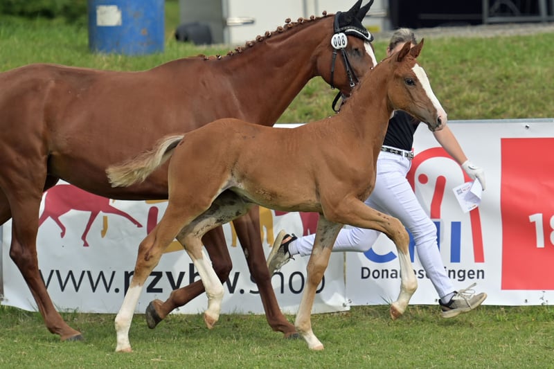 **Sales Advertisement: German Sport Horse – Mare** For sale is a promising filly from the breeding year 2025. She is an elegant chestnut with four white legs, impressing with her appealing charisma and harmonious appearance. She is GOLD awarded and achieved an outstanding 4th place in the finals at the Birkhoff Foal Championship. Furthermore, there are several half-siblings that are very successful in sports. This talented mare is ideally suited for dressage. Her friendly nature and willingness to learn make her an ideal partner for ambitious riders who want to make a breakthrough in dressage in 3 years. She is well-mannered, easy to handle, and in excellent health. The mare is halter-trained, knows how to load in a trailer, and is familiar with the farrier. If you are interested or have any further questions, please feel free to contact me. Visit us and see for yourself this wonderful foal!