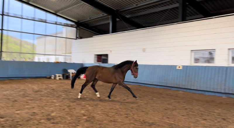 Direct van de fokker staat een 5-jarige ruin van Monte Bellino uit de Lola van Leonberg - Wolkenstürmer. Als veulen won deze slimme jongeman al het veulenkampioenschap in Rheinland-Pfalz-Saar voor springgerichte veulens met cijfers van 9 - 9,5 - 10 voor beweging. Volgens de afstamming is hij dubbelveranlagt. Allicht bereden toont hij zich zeer rijdzaam en in bovenmatige mate brave. Videosequenties onder het zadel kunnen na contact via WhatsApp worden verzonden. Bij interesse: 01705371172