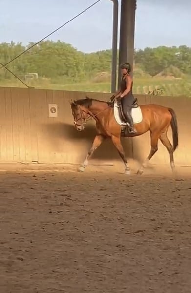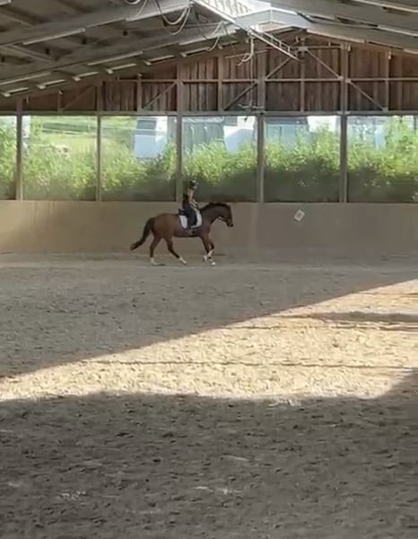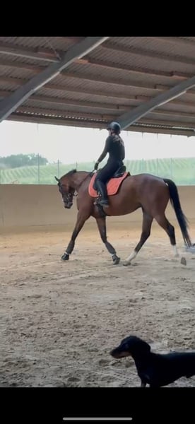 Small all-rounder with a big heart seeks 5-star home - English Thoroughbred - 6 years old - Gelding For personal reasons, I unfortunately have to part with my heart horse. This special gem came into my life 2 years ago directly from the racetrack and has captivated me from the very beginning with his character. Despite his past, he has never been stubborn or difficult, but always willing to learn and friendly. He is just starting to learn his new job as a dressage horse and is doing so slowly but reliably. However, he particularly loves trail riding or leisurely walks. He enjoys groundwork a lot, as he likes to be kept busy and needs exercise. He is also regularly worked with a long line and is open to any fun activities. We have already mastered a few small jumps together, and he shows his enjoyment here as well. Therefore, he can be worked with in a very versatile way. He has been regularly vaccinated and dewormed. I am not aware of any illnesses. He is regularly presented to the osteopath, which benefits him due to his previous use as a racehorse. Since he wears down his hooves quickly, he is currently shod four times and will need this for the foreseeable future. He is well-behaved for the farrier and loading. At 162 cm and with his slim build, he is not a weight carrier! He currently stays in the stable at night and is out in the pasture during the day. He gets along well with mares and geldings. It is important to me that he finds a loving, 5-star, forever home where he gets plenty of pasture time and varied activities. I can also imagine him in an open stable setting, but it must be considered that he is a Thoroughbred and will need to be blanketed in winter and on very rainy days. This is not a forced sale! Quality over price. Due to his age and training level, he is not a beginner's horse. If you are seriously interested, I look forward to hearing from you – he is looking for people who appreciate him just as he is. His new saddle and various accessories can be purchased as well.