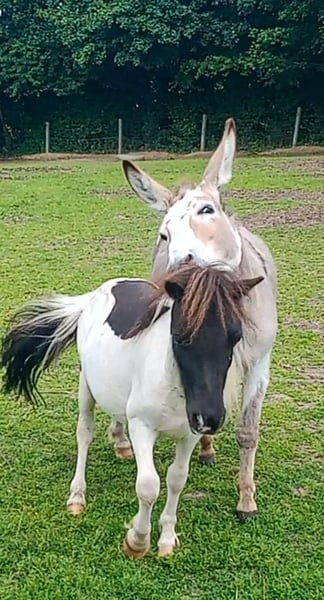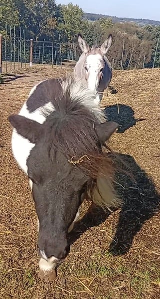 Eselhengst RAMON 3 Jahre jung, Hengst der in diesem Jahr Vater von bildhübschen Fohlen geworden ist, Esel- und Mulifohlen, die Stuten sind Minishettys und Shettys sucht nun ein liebevolles Zuhause, wo er betüddelt wird und seine Kraulreinheiten täglich bekommt. Ramon ist sehr auf den Menschen bezogen, lieb, tritt und beißt nicht. Ich muss ihn abgeben, da ich hier meine Mulihengste, einer davon ist und bleibt Mini Mini behalte und der Größenunterschied ist zu groß, wenn die alle in die Pubertät kommen. Ramon steht mit seinem Kumpel einem Shettyhengst, auch 3 Jahre jung zusammen und ggf könnten auch beide zusammen verkauft werden, da sie sich seit Fohlenalter kennen, es besteht aber auch die Option daß Ramon mit einer grauen Eselin, gemeinsam auszieht, die auch 3 ist und dieses Jahr ihr erstes Fohlen bekommen hat, was schon abgesetzt ist. Wir verkleinern hier unseren Bestand etwas, deshalb unterschiedliche Optionen..... Ramon und Shettyhengst Ronnieboy, der schwarz weiße Schecke - Preis für beide zusammen 2500 Euro Ramon mit Eselin Ronja - Preis für beide zusammen 2850 Euro Die Esel und Shettys folgen einem ohne Halfter sind alle superlieb. Bei Interesse beantworte ich nur Anfragen, wo dein Name steht und ich möchte vorab etwas von dem vlt neuen Zuhause erfahren, es sind für mich liebe Tierseelen, wo ich schon wissen möchte, ob das Zuhause liebevoll und passend ist. Liebe Grüße Melanie
