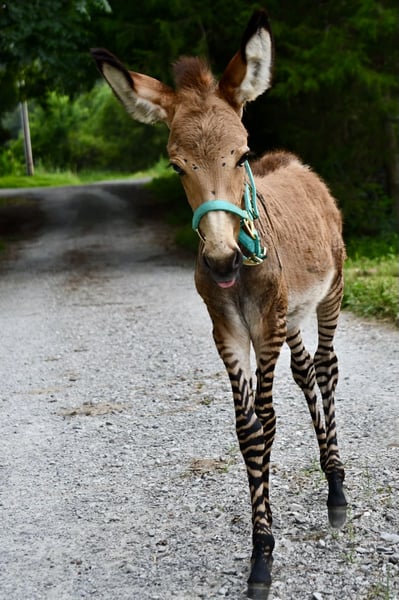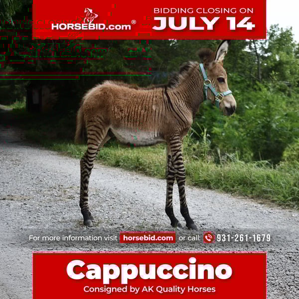 ♦️ MID-SUMMER SHOWCASE ♦️ Happening now thru MONDAY | JULY 14TH - Available EXCLUSIVELY on HorseBid's website! For more details and to register visit: www.Horsebid.com CONSIGNOR CONTACT: AK Quality Horses 931-261-1679 LOCATION: Sparta, Tn BREED: ZeDonk REGISTERED: No COLOR: Dun-Striped HEIGHT: 35in AGE: Weanling GENDER: Colt Cappucino is a beautiful cross of a Grevy Zebra and a Jenny. Grevys are the largest of the three species of zebras. Cappucino was a very thought-out baby, right down to the best jenny on the farm. He was bred to be big, gentle, and have perfect conformation. Ensuring a lifetime of success, whether that is to continue his journey as a therapy animal, a lovely petting zoo, or a partner in the arena or trails. Cap has spent every day being exposed to indoor environments, such as schools, nursing homes, and his favorite trips to tractor supply! He loves to follow our little boy around and play all day! We enjoy having Cappucino nosing into our business during the day and get a kick out of all the things he does, he is full of personality. Cap has a jenny best friend, who we will let go with him. These two love to play and entertain each other. At 14 weeks old he is still on the bottle but eating grain and hay, as well. You can continue his bottle feeding or switch him to a bucket. Feeding his bottle is my sons very favorite thing to do, so we have kept him on the bottle. We enjoy this beautiful boy and all the fun memories that come with owning something special like him. We would be more than glad to talk to you and give you the opportunity to love him. Give us a call at 931-261-1679 with absolutely any questions you may have!
