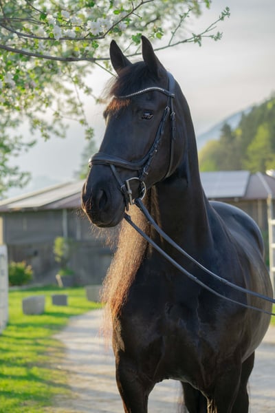 Excellent mare with outstanding pedigree (full papers) available for breeding or sport. She comes from the same lineage as the approved KFPS stallion Mans 543. The mare has already foaled once and performed exceptionally well in her role. At the breeding show, she was awarded the coveted STER premium at age three and was named reserve day champion. Her IBOP score is impressive at 75.5 points. She is a true sweetheart in handling. The mare has no vices and is sound for farrier and loading. In dressage, she is currently performing at a solid A-level. She requires an experienced rider and is not suitable for beginners. On trail rides in groups, she is always well-behaved and manageable. Quality over price. Please feel free to contact us if interested.