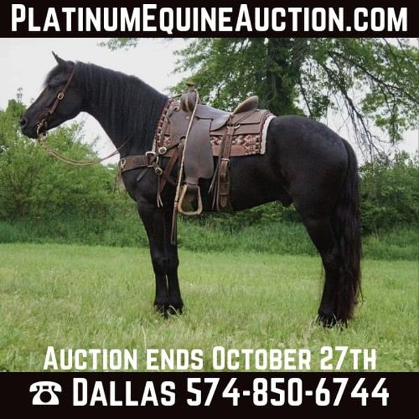 ONLINE AUCTION Place your bids at www.PlatinumEquineAuction.com Starting Bid $3500 Auction ends October 27th, 2024 Need a new saddle? Check out White Rock Saddles on our website or Facebook! Horses like Tuco come along once every lifetime or so. Some people may compare him to other great equine legends like Alexander the Great’s Bucephalus, Napoleon Bonaparte’s Marengo, or Hercules’ Pegasus! Tuco stands 15.3 and is %100 sound in every way! I’ve hauled and rode this gelding for jousting, rodeos, trail rides, renaissance fairs, and other play-days! He is well seasoned to all the traffic of vehicles, other horses, cattle, and even buffalo. Tuco has the handle of a true bridle horse and is soft and supple in your hand and also moves softly and quietly off of your leg queues. He has an excellent turn around and amazing side passes! In his videos you can see how he rides through a course set up for working equitation, and also while I handle a garrocho pole from him! My nine year old son has often ridden him to bring back cattle in the arena when we are roping and also to trail ride. Tuco is very brave anywhere he is and crossing obstacles like water, logs, and bridges are of no consequence to him. My wife has also enjoyed this wonderful steed and rides him in English tack while she is hacking around the roads and fields near our house. He is well acquainted with cattle and buffalo as I’ve roped many steers on him in the arena and a few outside while they were running loose. His manners on the ground are flawless and consistently quiet. He loads, shoes, bathes, and clips quietly and patiently with no trouble at all. I’ve owned him since December of last year and he has truly been a pleasure to have here and we really are going to miss him! Located in North Judson, IN. For more information call Dallas Schleg 574-850-6744. ONLINE AUCTION Place your bids at www.PlatinumEquineAuction.com Starting Bid $3500 Auction ends October 27th, 2024 Need a new saddle? Check out White Rock Saddles on our website or Facebook!