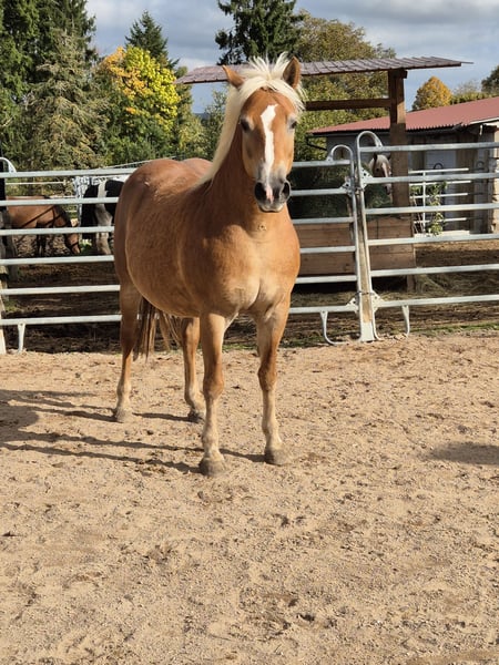 Hallo, ich muss mich leider aus persönlichen Gründen von meiner sehr lieben Haflinger-Stute trennen. Da es dringend ist, möchte ich sie deutlich unter Wert abgeben. Sie ist menschenbezogen und sensibel. Früher war sie im Sport eingesetzt und hat Spring- sowie Dressurturniere absolviert. Sie ist 12 Jahre alt und etwa 1,50 m groß. Sie hat einen Edelblutanteil von 1,95 %, den man ihr überhaupt nicht ansieht. Sie ist typisch Haflinger: ruhig, gelassen und arbeitswillig. Sie wurde als Fohlen prämiert. Sie hat keine bekannten Krankheiten, läuft barfuß und wurde regelmäßig entwurmt sowie geimpft. Sie ist sehr rangniedrig und daher perfekt als Beistellpferd geeignet. Sie verträgt sich mit allen. Momentan steht sie in einer gemischten Herde im Offenstall, kennt aber auch Paddockboxen. Sie liebt den Kontakt zu Menschen und ist vom Boden aus sehr lieb und engagiert. Da sie in ihrem Leben leider nicht nur positive Erfahrungen gemacht hat, ist sie nicht mehr reitbar. Sie beginnt beim Reiten unkontrolliert zu bocken, bis der Reiter auf dem Boden landet. Daher wird sie als Beisteller oder eventuell auch als Zuchtstute abgegeben. Wer ein super liebes Beistellpferd für die Bodenarbeit sucht, ist hier genau richtig. Über eine Nachricht mit einer kurzen Vorstellung würde ich mich freuen. Liebe Grüße.