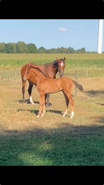 Dieses hochmoderne Hengstfohlen ist von Typ und Bewegung besonders interressant. Er hat die besondere Ausstrahlung seines Vaters geerbt. Vitero bewegt sich leichtfüßig mit aktiver Hinterhand und guter Knieaktion. Der edle Kopf, das blutgeprägte Exterieur, das sehr korrekte Fundament und die Langbeinigkeit stechen besonders hervor. Seine Körperpartien sind wie gewünscht: über viel Boden stehend, weit in den Rücken reichernder Widerrist, ausreichend lange Mittelhand die den Rücken gut schwingen und das Pferd sich leichter biegen läßt. Die Mutter hat zuvor bereits vier Fohlen für die Verdener Fohlenauktionen gestellt. Alle Fohlen waren aus dressurbetonten Hengsten gezogen. Eine Tochter davon, die auf der Auktion für 20T Euro zugeschlagen wurde, hat im Vielseitigkeitssport zahlreiche Gelände- und Dressurprüfungen der Klassen A - M gewonnen. Unter Julia Krajewski hat sie auch 6jährig die Bronzemedaille beim Bundeschampionat eingeheimst. Der Vollbruder (Radero) ging über die Verdener Auktion in einen Dressurstall nach Dänemark. Eine Tochter von Raven wurde 3 jährig mit dem 1a Preis und als Prämienanwärterin ausgezeichnet. Die ebenfalls von mir gezogene Vollschwester der Mutter namens "Starena" hat dreijährig die beste Leistungsprüfung ihres Jahrgangs im Bereich Springen abgelegt. Dabei erhielt sie u.a. eine 9,5 für die Rittigkeit und zweimal die Wertnote 10 für das Springen. Außerdem stand sie den Dressurstuten in Typ und Bewegung kaum nach. Sie gewann das deutsche Elitenstutenchampionat in Lienen und die bedeutendste Sutenschau Hannovers, die Herwart von der Decken Schau als Gesamtsiegerin. Für das hier angebotene Fohlen darf also von einer sehr guten Rittigkeit sowohl von Mutter- als auch von Vaterseite ausgegangen werden, da auch der Vater Viva Romance in seinen Prüfungen hohe Rittigkeitsnoten erzielte. Dass der Mutterstamm von diesem Hengst bereits 10 gekörte Hengste hervorbrachte spricht für sich. Außerdem ist die hervorragende Gesundheit dieses Stammes und die Härte des Springblutes, das zudem Stärke im Rücken und einen guten Galopp vermittelt, m.E. ein wesentlicher Faktor für die Kaufentscheidung. Die Anpaarung verringert zudem die Wahrscheinlichkeit der Degeneration von Hals- und Brustwirbeln wie sie vermehrt bei reinen Dressuranpaarungen durch die Inzucht über viele Generationen hinweg auftrit. Das Fohlen kann natürlich jederzeit und völlig unverbindlich auf der Weide in Augenschein genommen werden. Sein hervorragender Typ zeigt sich dem Betrachter dann noch wesentlich deutlicher als auf Bildern. Videolink https://youtu.be/ok6kH9JtG4M