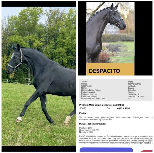 Hallo aus gesundheitlichen Gründen müssen wir leider unsere kleine aber feine Hannoveraner Zucht aufgeben. Derzeit suchen wir für unsere total liebe und gesunde Stute Luna ein neues fünf Sterne Zuhause , sie ist derzeit tragend von Despacito und muss auch nicht sofort weg nur wenn alles stimmt . Sie ist sehr gut geritten und eine unkomplizierte Stute die noch nie krank war bei uns. Es steht zu Option die Sute tragend zuerwerben ( Preis auf Anfrage) oder nach dem absetzen des Fohlen ohne Fohlen , dann allerdings mit Pflegeschutzvertrag kostenlose Überlassung .