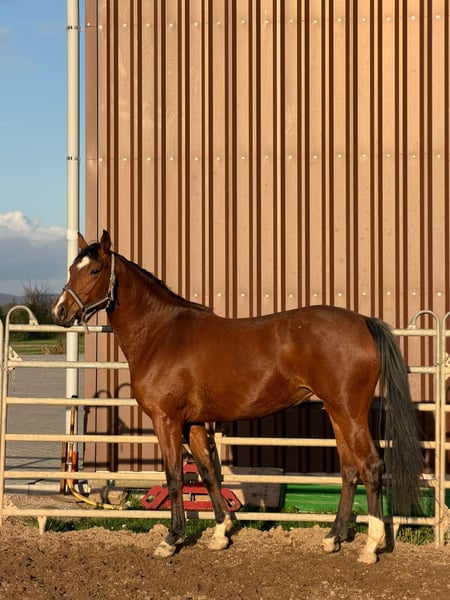 Questa puledra di 3 anni si distingue per il suo carattere amichevole e il temperamento equilibrato. Nel quotidiano si mostra obbediente, attenta e molto affettuosa con le persone. È facile da gestire e conosce le procedure di base in scuderia. La puledra è ancora non montata, come si addice alla sua età, ma possiede tutte le qualità ideali per un suo ulteriore sviluppo. Durante il salto libero dimostra già grande talento, una buona tecnica e una visione d’insieme durante il salto. Rimane sempre calma e resistente allo stress. Una promettente giovanissima cavalla con caratteristiche ideali per il salto ostacoli o per un’educazione versatile.