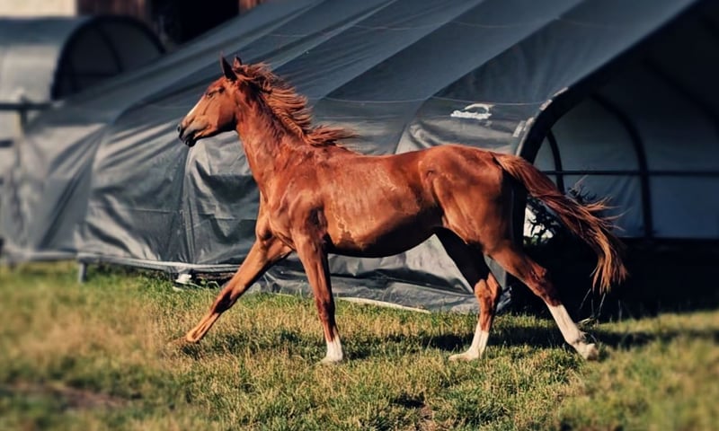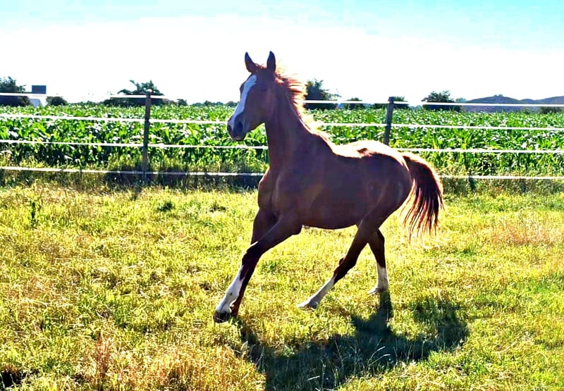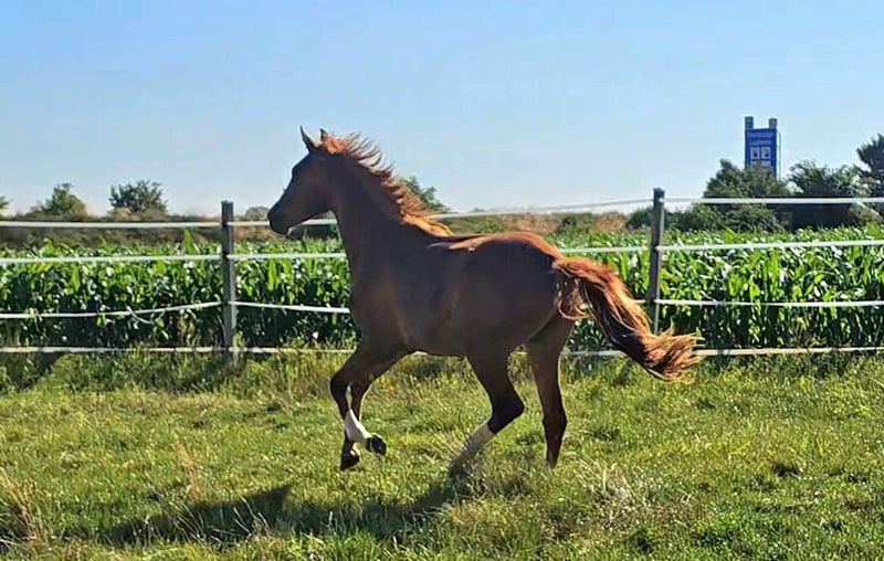 We are looking for a new home for a very special, two-year-old, untrained mare with the potential for ambitious, athletic development for big tasks and higher demands! - **Breed:** Hanoverian - **Gender:** Mare - **Year of Birth:** 2023 - **Color:** Colorful chestnut - **Height:** 172 cm - **Suitability:** Eventing, Dressage, Show Jumping - **Training Level:** Untrained This talented, energetic young mare impresses not only with her attractive appearance, her distinctive head, and her enormous power but also with her unique character and strong will. She is ideally suited for eventing and already shows promising approaches in both dressage and show jumping. Like one would expect from a young and blooded horse, she has a lot of go and an iron will. She is not easily manipulated and enjoys challenging her human. She likes to test whether our will is at least as strong as her own and whether it is worth it for her to commit to her human. Like a wild child. However, once you have convinced her, she will be on your side forever. She does not follow just anyone and certainly not under pressure. One must be smarter than she is and know exactly what they are doing and wanting. The person whom this strong-willed mare follows should consider themselves lucky to have a true warrior by their side, one who would go to great lengths for their human if necessary... The mare is well-socialized, lives in a mixed-age herd of mares, and is therefore accustomed to interacting with other horses. She is dominant, rather high-ranking, but knows how to subordinate herself as well. She is not a bully but does not allow herself to be pushed around either. She does not provoke conflict but does not shy away from it either. She has incredible endurance and is ready to grow together with her new, own human. She will become a true, demanding sport horse, so we do not see her as suitable for weak or inexperienced riders. She has enormous strength and more than enough frame and caliber, making her also well-suited as a horse for men. If you are interested or would like more information, we look forward to your message.