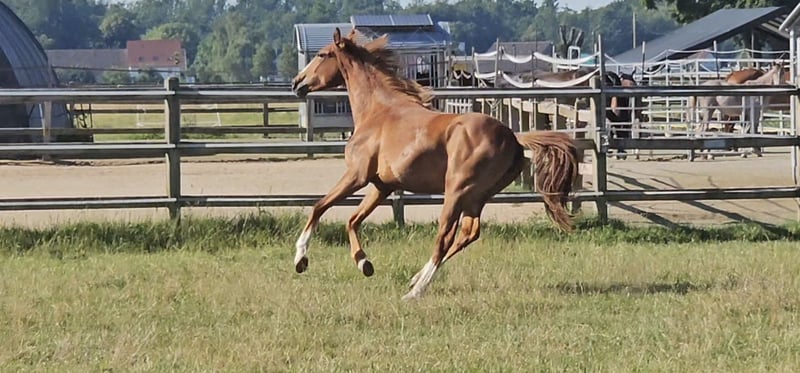 UWAGA: PRZY SZYBKIEJ REALIZACJI ZAKUPU (do 15.08.) KUPUJĄCY OTRZYMUJE ZNIŻKĘ CENOWĄ W WYSOKOŚCI 20% !!!! (źrebak może pozostać w hodowli bezpłatnie do 30.10. tego roku!) Szukamy nowego domu dla wyjątkowej, dwuletniej, nieoswojonej klaczy, która ma potencjał do ambitnego, sportowego rozwoju aż po duże wyzwania + wyższe wymagania! - **Rasa:** Hannoveran - **Płeć:** Klacz - **Rok urodzenia:** 2023 - **Kolor:** kolorowy lis - **Wysokość w kłębie:** 172 cm - **Przeznaczenie:** Wszechstronność, ujeżdżenie, skoki - **Stan wykształcenia:** nieoswojona Ta utalentowana, pełna energii młoda klacz nie tylko zachwyca swoim atrakcyjnym wyglądem, charakterystyczną głową i ogromną mocą, ale również swoim wyjątkowym charakterem i silną wolą. Nadaje się doskonale do sportu wszechstronnego, już teraz pokazuje obiecujące podejście zarówno w ujeżdżeniu, jak i w skokach. Pani klacz ma - jak przystało na młode i pełne krwi konie - dużo energii i żelazną wolę. Nie da się łatwo zmanipulować i chętnie stawia wyzwania ludziom. Lubi testować i dokładnie sprawdzać, czy nasza wola jest przynajmniej tak silna jak jej własna, czy warto się dla nas starać. Jak dziki koń. Jednak gdy już uda się ją przekonać, to będzie stała po naszej stronie na zawsze. Nie podąża za każdym. Już na pewno nie pod presją. Trzeba być mądrzejszym od niej i dokładnie wiedzieć, co się robi i czego się chce. Osoba, za którą podąża ta silna charakterem klacz, może czuć się szczęśliwa, mając przy sobie prawdziwą wojowniczkę, która w razie potrzeby oddałaby życie za swojego człowieka... Klacz jest dobrze socjalizowana, żyje w stadzie klaczy w różnym wieku, więc zna kontakt z innymi końmi. Jest dominująca, raczej na wysokiej pozycji, ale potrafi się również podporządkować. Nie jest agresywna, ale też nie pozwala się zaczepiać. Nie prowokuje kłótni, ale też nie unika ich. Ma niesamowitą wytrzymałość i jest gotowa rozwijać się razem ze swoim nowym, własnym człowiekiem. Będzie prawdziwym, wymagającym sportowcem, dlatego nie widzimy jej raczej dla słabych, niedoświadczonych jeźdźców. Ma ogromną moc i więcej niż wystarczającą budowę i kaliber, więc nadaje się również jako koń dla mężczyzny. W przypadku zainteresowania lub w celu uzyskania dalszych informacji czekamy na Twoją wiadomość.