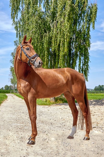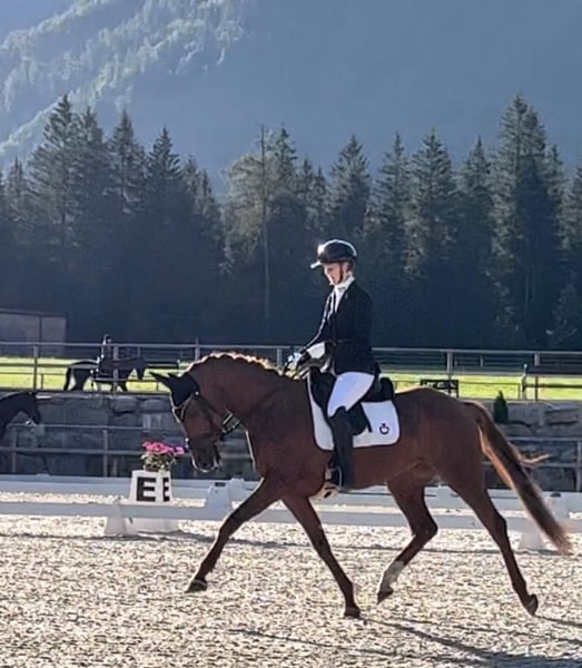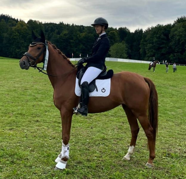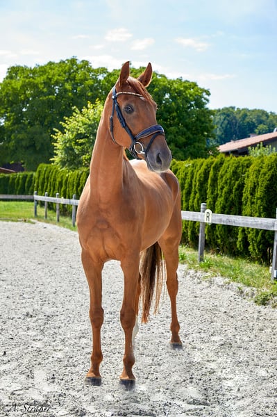 Zum Verkauf steht eine bildhübsche 4-jährige Hannoveraner Stute von Valverde x De Niro. Mit einem aktuellen Stockmaß von ca. 1,66m und noch im Wachstum stehend, ist Versace somit das ideale Damen- und Juniorennachwuchspferd. Die Stute ist erst seit Kurzem unter dem Sattel, konnte aber ihre überragende Qualität bereits bei ihren ersten Turnierstarts unter Beweis stellen. Drei Siege mit Gesamtnoten bis 8,1 und Einzelnoten bis 8,5 gehen auf ihr Konto. Versace überzeugt nicht nur durch ihre hervorragende Qualität, sondern auch durch ihre Rittigkeit sowie Leistungsbereitschaft und ihren einwandfreien Charakter. Dennoch ist aufgrund des jungen Alters Jungpferdeerfahrung und ein reiterliches Können auf A/L Niveau wünschenswert. Auch im Umgang ist sie absolut brav, unkompliziert und sehr menschenbezogen. Eine große AKU inkl. Röntgenbilder ohne Befund liegt vor! Anfragen bei ernsthaftem Interesse bitte nur telefonisch oder per WhatsApp unter +49 176 46187186
