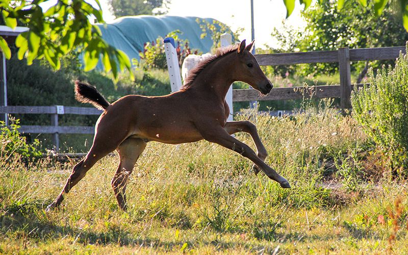 Fünf Sterne S von Freigeist a. d. Londontimes Lola S v. Londontime Hanoverian mare | Brown | 15.06.2022 born The name says it all. This beautiful, lively filly has a movement quality in a class of its own. Light-footed, with a lot of energy, it shows great movement dynamics with a very good uphill tendency. With a lot of thrust from the hindquarters, she just floats over the court. She has a lot of energy and fun moving. All three basic gaits are of exceptional quality. This typey filly is smart, self-confident and people-oriented, she has learned the foal ABC in a playful way, worm curing, leading or introducing herself to the blacksmith is no problem with her. She grew up with us on the farm. The horses are in the herd 24/7 on pasture in summer and in group exercise in winter. The dam mare has a height of a good 170 cm, so we expect a final size of the foal of 1.60 m / beginning 1.70 m. We run a small breeding. All horses have family connections, are people-oriented and are raised and trained with a lot of knowledge and heart. The foals are weaned gently and carefully, the upbringing and training takes place with knowledge of the horse's and learning behavior with a lot of love and without coercion. The foal is placed in suitable, supportive hands. When selling, we prepare the foal for separation and transport, which means we need a bit of lead time - buying today, picking up tomorrow will be difficult. There is also the possibility that the foal will stay here for rearing. The sire Freigeist (by Foundation) belongs to the young stallion stock of the Lower Saxony State Stud and was recently awarded the World Meyer Prize. You can find more information about breeding and rearing on our website schroetershof.de or give us a call.