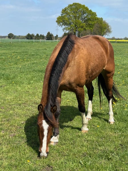 Schön gezeichnete 5j Allroundstute. Flirtini ist bei uns geboren, aufgewachsen und angeritten worden. Jetzt darf sie gerne in ein schönes neues zu Hause mit Jungpferdeerfahrung umziehen. Im November hat sie ihre Stutenleistungsprüfung mit Noten zwischen 7 und 8 absolviert (siehe Zuchtbuchauszug). Aus einem sehr guten Holsteiner Stamm stammend (Stammnummer 1463) eignet sie sich sowohl fürs Springen als auch für die Dressur. Im Gelände waren wir letztes Jahr ebenfalls regelmäßig. Grundsätzlich ist sie brav und gut zu reiten. Aufgrund des Alters ist sie trotzdem nicht für Anfänger geeignet. Sie steht hier im Aktivstall und fühlt sich draußen mit viel Bewegung sehr wohl. Im Alter von 3 Jahren wurde sie geröntgt. Diese Bilder sind ohne Befund. Bei uns war sie bisher kein einziges Mal krank. Wir wünschen uns für sie jemanden, der sie fördert und ihren sehr menschenbezogenen Charakter wertschätzt. Im Umgang ist sie sehr lieb und immer auf ihren Menschen fixiert.