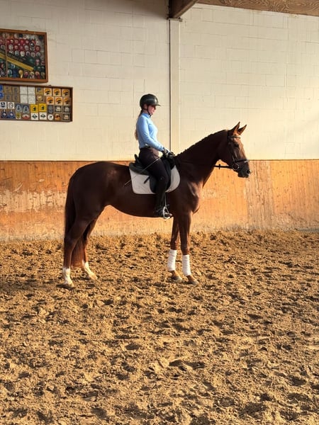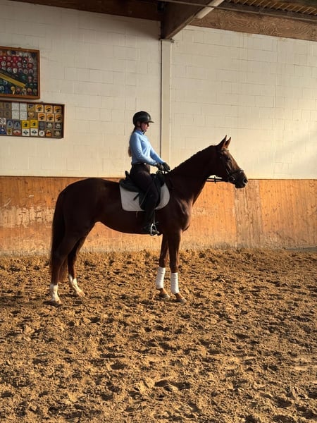 Flora Flora from the Finnigan-Weltregent line has had ample time to mature with her breeder, growing up gently and being lightly started under saddle. She is now 6 years old and consistently demonstrates her good temperament through her maturity. Her large frame, smooth gaits—particularly her excellent walk—and her rider comfort are her key qualities. A recent veterinary inspection is available. Unfortunately, she has a respiratory noise, which does not affect her performance. Price: €12,000 | Height: approximately 16.1 hh