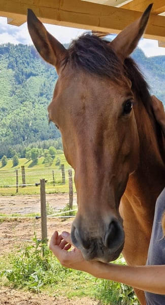 My Hanoverian mare Fryda is looking for the right owner. Due to lack of time, I am selling my 9-year-old, very unspoiled mare. She is highly interesting for breeding, thanks to her pedigree and her expressive, energetic gaits. At age 6, she already had a foal and was very uncomplicated during that time. Fryda has also been ridden; she was ridden by her breeder in Germany (before her foal), but I haven't ridden her for a longer period due to my pregnancy. I am just starting to ride her again. She shows herself to be quite inexperienced and cautious but never mean. If she is not used for breeding, her rider should be calm and gentle with her, providing the security she still needs to gain confidence. In handling, she is a treasure—knows everything typical for the farm. She is rather low in the herd hierarchy, accustomed to stall and pasture turnout. She has never been ill, is shoe- and loading-trainable, and measures approximately 16.1 hh. A fantastic breeding mare, and with sufficient riding skills and patience, she could also be suitable for the big arena or possibly eventing (free jumping reportedly good according to her breeder). More information and videos are available upon personal contact.