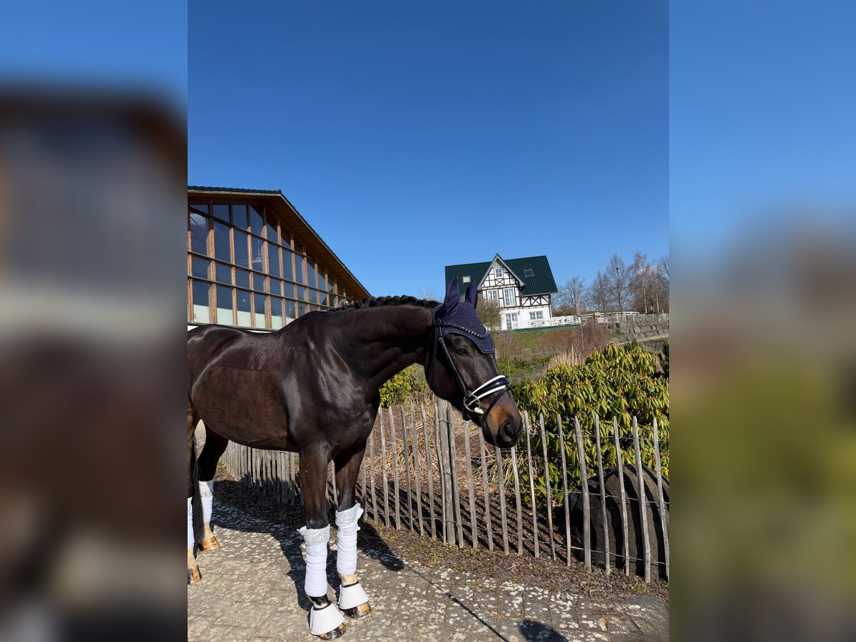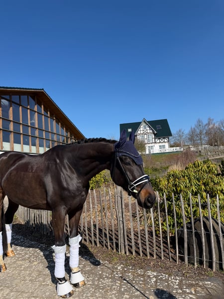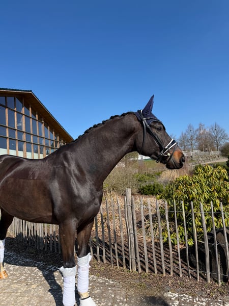 For sale is this impressive 6-year-old gelding by Despacito x Scolari, who boasts exceptional quality as well as a stunning exterior and interior conformation. He is already placed in Dressage Horse L level and is now learning the movements for the next class in a playful manner. He demonstrates a great talent for lateral movements. In handling, he is very well-behaved and confident, and he rides equally calmly, making him suitable for children or reiners returning to riding. At competitions, he remains very relaxed and is not distracted by his environment. He is turned out with other geldings and shows excellent social compatibility. Naturally, he is shoeing and loading-friendly. "Deichkind" combines extraordinary quality with an exceptionally good and balanced character, making him the perfect partner for sport and leisure. A current veterinary health certificate is available. "Deichkind" is located in 35708 and can be tried out at any time! For interest or further questions: 017620052380, WhatsApp available as well.