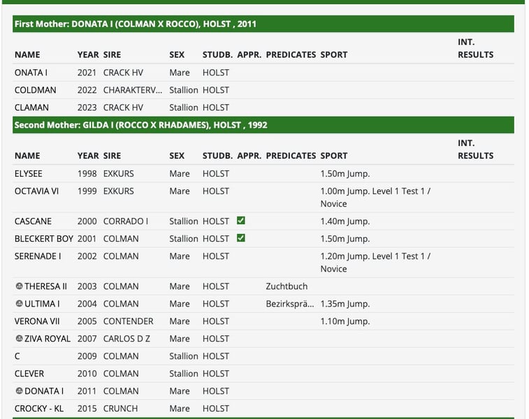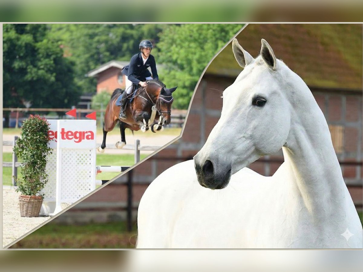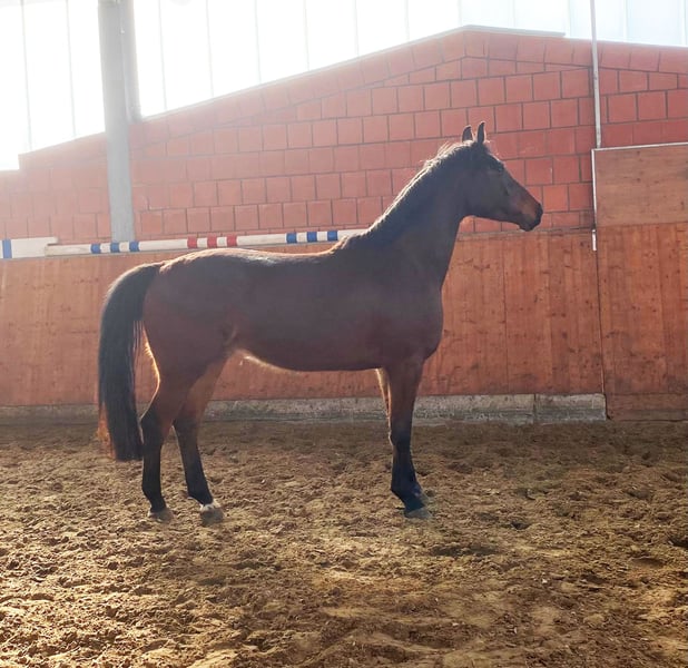 Charakterny, dużej budowy 4-letni ogier od charakterystycznego HV x Colman Ten atrakcyjny 4-letni ogier o wzroście 169 cm prezentuje się jako sympatyczny koń młodego pokolenia, o bardzo przyjemnym charakterze, dobrej postawie i łatwym w codziennym kontakcie. Podczas skoków luzem wykazuje już zdolności, orientację i dobre maniery, co czyni go interesującym kandydatem do dalszej edukacji. Rodowód: Ojciec to Charaktervoll HV, odnoszący sukcesy do 1,45 m w skokach, syn Comme il Faut. Matka tego ogiera, Donata I, posiada cenną genetykę holsztyńską od Colman (v. Carthago x Lord). Matka została wyróżniona nagrodą dzielnicy i pochodzi z renomowanej rodziny z sukcesami w skokach do 1,50 m, w tym Elysee i Bleckert Boy. Koń został w 2024 roku przebadany rentgenologicznie przed uwięzieniem i oceniony jako zdrowy. Dalsze informacje lub możliwość obejrzenia po uprzednim umówieniu.