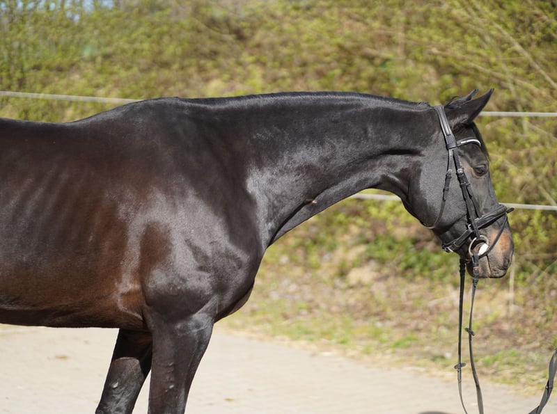 A handsome Holsteiner gelding, born in 2017, with an elegant black-brown coat, is available for sale. His pedigree is spring-focused, sired by Kannan out of a Contendro mare, making him ideally suited for sport. He has already been successfully presented at shows up to class L. Training has also included higher performance levels. "Queenie" impresses with his rideability and solid training. He is well-schooled in dressage, soft in the aids, and pleasant to handle. Flying changes are performed confidently. In the show jumping phase, he is motivated, careful, and eager to perform. In handling, he is completely straightforward and shows no bad habits. He is well-behaved both alone and in a group when hacking out. At competitions, he remains calm and relaxed and is always easy to manage. Loading onto the trailer or truck is trouble-free, and he stands quietly during loading. He is also exemplary with the farrier and veterinarian. The gelding is up-to-date on vaccinations for competition and is regularly treated by a veterinarian and osteopath. A reliable partner for ambitious riders, bringing joy both in sport and in daily riding. Further information and videos from recent competitions (March 2026) are available upon request.