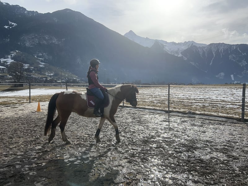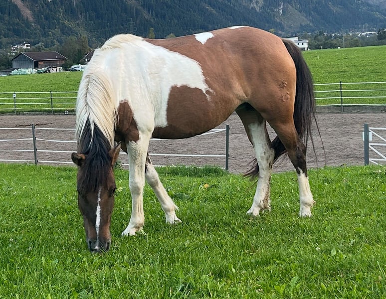 Juma is a very beautiful Huzul mare. She is registered for breeding and has a distinctive pinto coat. Her hooves are excellent, and she tolerates barefoot riding very well, even on rocky terrain. She is very sociable within her herd. Unfortunately, she is not happy in our riding school environment, as she struggles with having different riders frequently. It would also be better for her to have a more experienced rider, since she is still at the beginning of her training. We have already enjoyed relaxed group rides with her. She loves grooming sessions with multiple children at once and enjoys groundwork. She is also used for guided children's rides, during which we ride alongside a country road (speed limit 100 km/h), and she handles it very confidently. In groundwork, she responds very sensitively to aids. She would likely be well suited for circus tricks and performances. We also see her as a suitable horse for trail riding and long-distance rides, as she has experience in this from her previous owner. When ridden outdoors, Juma is highly motivated and very calm. Her teeth have been recently checked and treated. All vaccinations are up to date. For Juma, we are looking for a place in an open stable or a large herd box. We only have standard boxes, which she does not really like, as she used to live freely in a herd before.