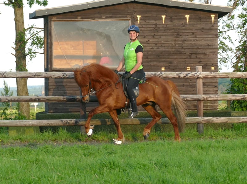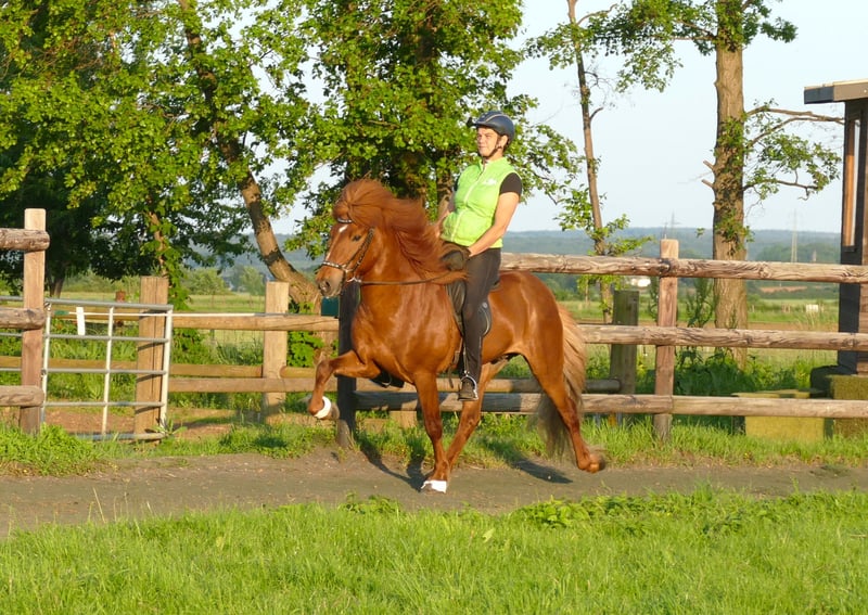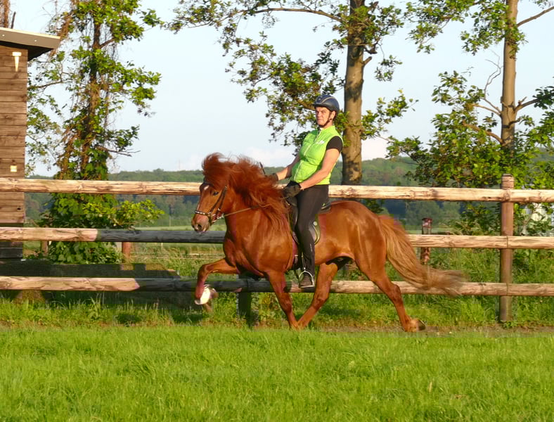 Baron- wie aus dem Bilderbuch Unser Baron ist der absolute Vorzeigehengst: wenn man es nicht weiß, würde man nie auf die Idee kommen, dass er Hengst ist. Er wiehert nicht, steht neben jeglicher Stute super brav am Balken, wälzt sich in Anwesenheit von Stuten frei in der Halle und man kann ihn unkompliziert mit anderen Pferden im Paddock halten. Neben seinem tollen Wesen und dem ausgeglichen Charakter, verfügt Baron auch über eine tolle Abstammung: Sein Vater Arion frá Eystra-Fróðholti ist mit sagenhaften 8,91 Punkten Fizo geprüft. In seiner eigenen Fizo hat Baron 8,04 als Gesamtnote mit einer 8,14 für sein Gebäude. Baron selber hat 14 eingetragene Nachkommen. Er hat ein gutes Fundament mit korrekten Beinen und einer starken Oberlinie. Mit diesem Körper weiß er umzugehen- Er wird überwiegend viergängig geritten und zeigt vier ganz gleichmäßige Gänge mit gutem Takt und ansprechender Vorhandmechanik. Auch sein Pass wurde angetestet und zeigt sich sehr vielversprechend für Fünfgang. Für seinen Schritt erhielt er bereits Einzelnoten bis 7,5 Punkte. Zu erwähnen ist, das Baron ganz sicher in allen Gängen durchs Genick geht und somit immer eine tolle Silhouette bildet. Er war mit uns bereits auf Turnieren, da zeigt er sich gelassen, ebenso hat er auch sein Seepferdchen gemacht, als er mit Chef Achim in Holland am und im Meer war! In der Gruppe reiten ist absolut kein Problem und auch ansonsten ist Baron ein richtiges Rundumpaket- Interieur, Exterieur, Gänge! Baron ist für Jugendliche und Erwachsene gleichermaßen geeignet und ist ein traumhafter Ausreit-Freizeit-oder Sportpartner.