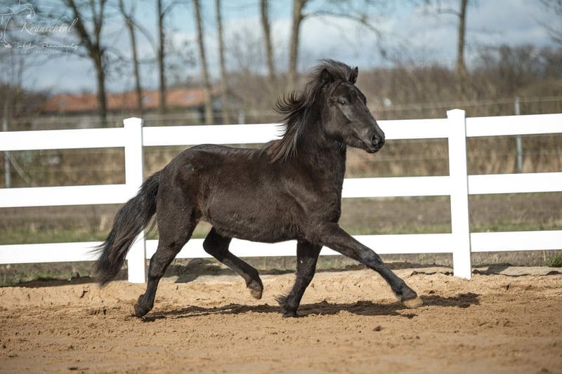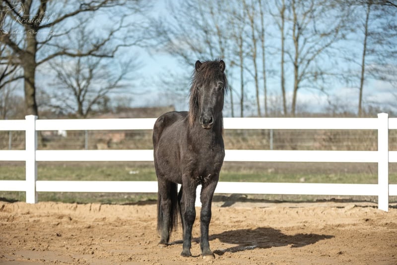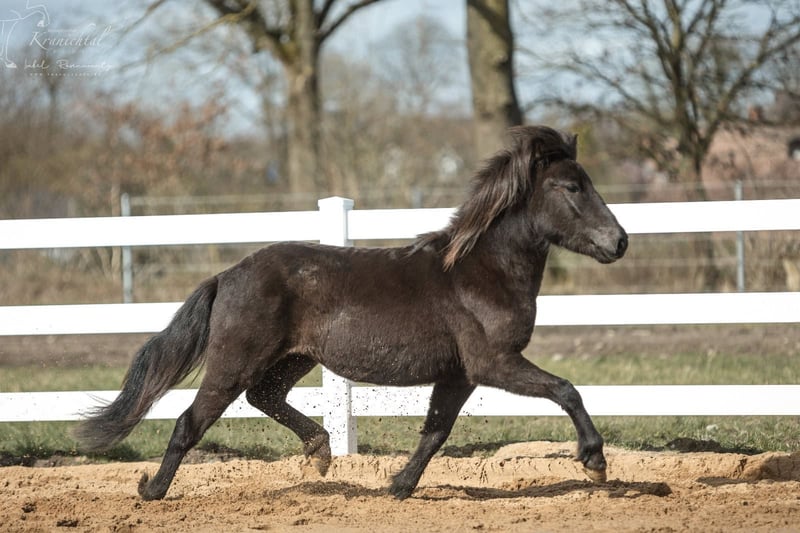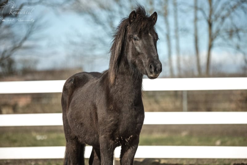 Beschreibung: Fáfnir ist ein im sportlichen Typ stehender 2-jähriger Hengst. Er hat sehr viel Potenzial, welches ihm seine guten Eltern vererbten. Im Umgang ist er dem Menschen gegenüber sehr aufgeschlossen, freundlich und immer unkompliziert. Seine ersten Bodenarbeits-Übungen hat er sehr kooperativ gemeistert. Dabei sind seine feinen Reaktionen und seine jetzt schon außergewöhnliche Tempofähigkeit im Freilauf aufgefallen. Aufgrund seiner sehr guten Eltern können wir ihn uns als späteres Sportpferd vorstellen. Ausbildungsstand: Fáfnir ist noch roh, kennt aber schon das Halfter und die Hufpflege. Vater: Außergewöhnlicher Fünfgänger. 3-facher WM-Teilnehmer. Naddur vom Schluensee ist ein großer Fizo-Elite geprüfter Rapphengst, der seine hervorragende Qualität auch schon bei etlichen nationalen wie internationalen Meisterschaften bewiesen hat. 2015 und 2017 startete er auf der Weltmeisterschaft. Aber nicht nur er selbst ist hocherfolgreich im Sport unterwegs gewesen, auch seine Nachzucht kann sich schon mit Meisterehren schmücken (unter anderem die deutsche Meisterin im Töltpreis Náttrun vom Forstwald). Zudem verfügt Naddur über einen außerordentlich freundlichen Charakter, den er seinen Nachkommen mitgibt. Pflegezustand: Kerngesund, deutsch gezogen, ekzemfrei, aus ekzemfreien Elternlinien. Preiskategorie: B - bis 20.000€ https://www.kranichtal.de/pferde/jungtiere/fafnir/