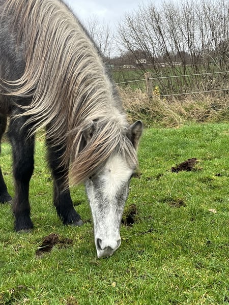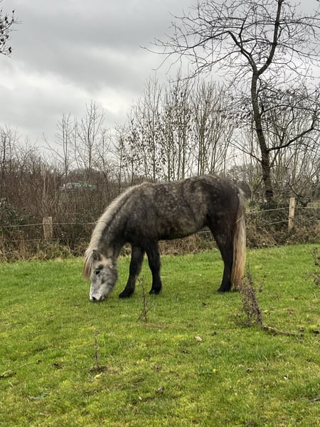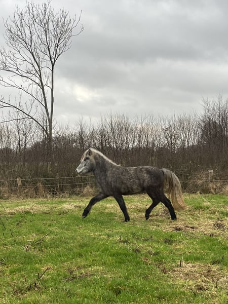 Skinna ist eine große (momentan knapp 1,40m), 2jährige Rappschimmelstute, die beim Züchter sorgfältig betreut und in einer Stutengruppe aufgewachsen ist. Der Vater ist der Fuchsschecke Leikur vom Uhlenhof (gekört, geprüft mit 8,08), der seine Charakterstärke und sein stabiles Fundament vererbt. Die Schimmelfarbe hat sie von ihrer Mutter. Skinna ist Neuem gegenüber gelassen und neugierig. Sie ist halfterführig, kennt Hufe heben und bearbeiten, Hänger fahren und Jungpferde-Schrecktraining. Ansonsten ist sie altersgemäß roh und wird bei sachkundiger Ausbildung aufgrund ihres guten Körperbaus und ihrer Größe sicher ein hervorragendes Freizeitpferd.
