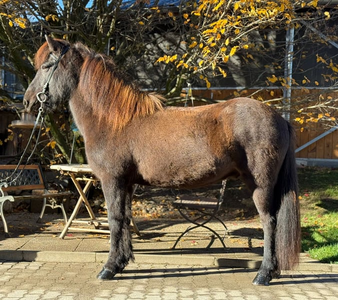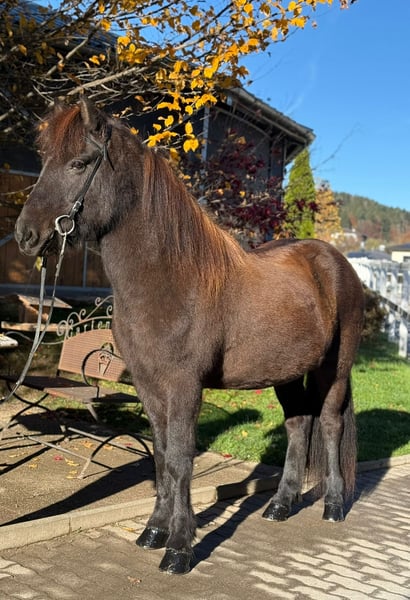 Spyrnir frá Álfhólum Gelding, 14.1 hh, born in 2013 in Iceland Four-gaited Free of eczema Vaccinated, shod, and dewormed ✅ Sire: Íkon frá Hákoti 7.98 (Ext 7.80, Re 8.10) Dam: Töfri frá Kjartansstöðum 8.45 (Ext 8.29, Re 8.55) ‼️ Granddam: Spyrna frá Vorsabæ II 7.85 (Ext 7.85, Re 7.84) Great-granddam: Snjall frá Vorsabæ II 8.31 (Ext 8.18, Re 8.40) ‼️ This stunning black gelding captivates not only with his solid build and distinctive star but also with his friendly nature. He is a reliable partner you can always count on. Under saddle, he impresses with four clearly separated gaits: an easy-to-ride tölt that is simply fun, a lively trot, an uphill, powerful canter, and a relaxed, comfortable walk that invites you to breathe easy. He is familiar with indoor arena, round pen, and oval track, and enjoys lunging, showing attentiveness and eagerness to learn. However, his heart truly belongs to trail riding – here, he truly blossoms and happily tölts through the terrain. In everyday handling, he is an absolute gem: he knows double-stall and herd life, is uncomplicated, social, and always friendly. A horse you simply have to like – with a temperament that provides calm, joy, and makes each day a little brighter. Spyrnir can be visited and tested at any time by arrangement at our place in A-5221 Lochen am See.