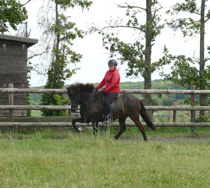 Nattar - grand Islandais, grand avenir ! Ce superbe et immense hongre noir présente un ensemble parfait pour une vie de cheval de selle idéale. Commençons par sa grande taille et sa construction harmonieuse - il peut facilement accueillir de grands cavaliers. Ensuite, il possède 4 allures au-dessus de la moyenne. Son tölt nous enchante dès le départ avec une grande amplitude et beaucoup de mouvement. De plus, il est super facile à monter et extrêmement confortable. Ses allures de base sont, comme pour un cheval à quatre allures, sûres, rythmées, expansives et montantes. Le galop est régulier, possible à un rythme tranquille et très bien équilibré. Nattar est un cheval de selle absolument honnête, avec un caractère irréprochable, qui invite à de nombreuses promenades merveilleuses. Nattar est déjà monté par des enfants en toute sécurité, les adolescents et les adultes ne posent aucun problème pour lui. En extérieur, il est intrépide, ne se laisse jamais entraîner par le groupe et tölte joyeusement le long des chemins. Dans l'ensemble, ce jeune hongre est un véritable jackpot - grand, talentueux, gentil !