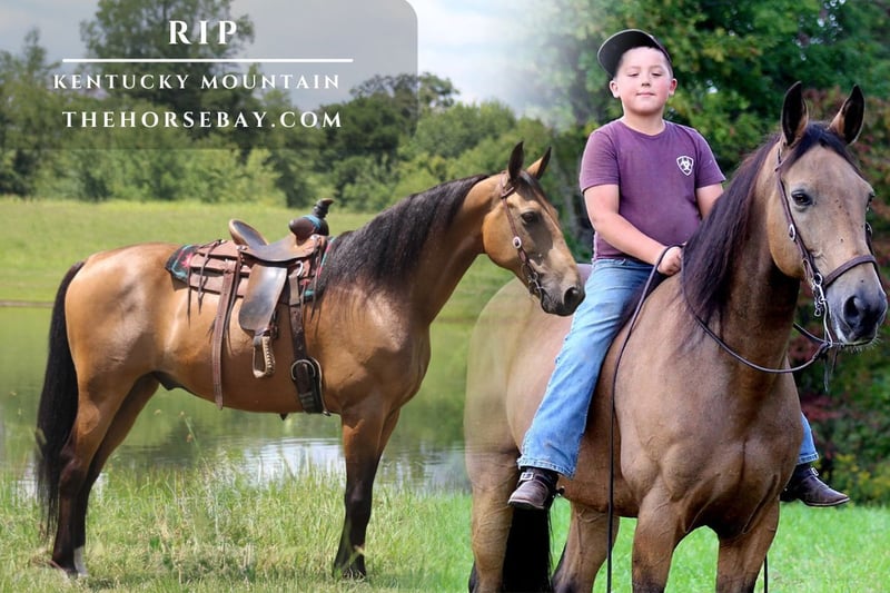Rip is a beautiful 11-year-old KY mountain buckskin gelding. Standing at 15.1 hands tall. He’s the total package- well-mannered, dependable, and has the looks! He’s built to last, with a heart and mind of a true trail partner. Rip has plenty of experience on the trails and will go wherever you point him- through water, over logs, up or down steep hills. He’s surefooted, confident, and never in a hurry unless you ask him to move out. Rip rides out alone or in a group, leads or follows without issue, and isn’t bothered by traffic, dogs, or wildlife. On the ground, Rip is gentle and respectful- easy to catch, saddle, bridle, load, and stands quietly for mounting, farrier, and grooming. He has a kind eye, a good brain, and a steady personality that makes him enjoyable for just about anybody in the family. If you’re looking for a safe, seasoned trail partner with a willing heart, Rip is your guy!