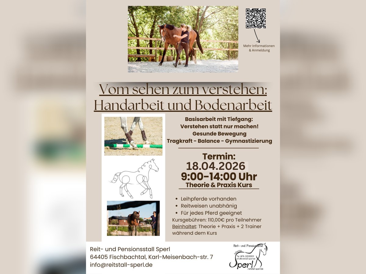 Termin: 18.04.2026 9:00-14:00 Uhr Buchungen und Zeitliche Abläufe über das Reitbuch: https://reitstall-sperl.reitbuch.com/course.php?c=77 oder das untenstehende Kontaktformular Vom Sehen zum Verstehen: Handarbeit & Bodenarbeit Dieser Kurs verbindet fundiertes Wissen mit direkter Umsetzung und zeigt, wie Hand- und Bodenarbeit zu einem wertvollen Bestandteil des Trainingsalltags werden kann – für ein gesundes, tragfähiges und geschmeidiges Reitpferd. Gemeinsam in der Gruppe sammeln wir zu Beginn gezielt Themen, Fragen und Problemstellungen rund um Handarbeit und Bodenarbeit. Die Inhalte entstehen somit nicht nach einem starren Plan, sondern orientieren sich an den Bedürfnissen der Teilnehmenden und ihrer Pferde. Aus diesen Themen entwickeln wir sinnvolle Übungen, die gezielt gymnastizieren, Kraft aufbauen und die Balance des Pferdes verbessern – als wichtige Grundlage für Tragfähigkeit und Vorbereitung auf Versammlung. Im anschließenden Theorieteil werden die großen Zusammenhänge verständlich erklärt: Welche Wirkung haben die einzelnen Übungen auf den Pferdekörper? Welche Muskelgruppen werden gestärkt? Wie unterstützen Grundlektionen an der Hand die langfristige Gesunderhaltung? Und wie lassen sich Bewegungsabläufe korrekt erkennen und beurteilen? Zwei Trainer begleiten die Veranstaltung parallel: Ein Trainer demonstriert die jeweilige Übung praktisch am Pferd, während der zweite Trainer zeitgleich erklärt, was im Körper des Pferdes passiert, woran man gesunde Bewegung erkennt und wie sich eine korrekte Ausführung beurteilen lässt. Ein besonderer Schwerpunkt liegt auf dem Verstehen von Problemen und Lösungswegen. Nicht jedes Pferd kann eine Übung sofort korrekt umsetzen. Wir besprechen typische Fehlerbilder, erklären mögliche Ursachen und zeigen, wie der Weg zur korrekten Ausführung aussehen kann – pferdegerecht, nachvollziehbar und individuell. Im Anschluss wird die Gruppe geteilt. Jede Gruppe erhält 1,5 Stunden intensive Praxis, um die erarbeiteten Inhalte unter Anleitung umzusetzen, zu festigen und auf das eigene Pferd anzupassen. Der Kurs zeigt außerdem, wie sich regelmäßige, kurze Grundlektionen an der Hand leicht und sinnvoll in den Alltag integrieren lassen – oft wertvoller als lange Trainingseinheiten. Richtig eingesetzt fördern sie die Gesunderhaltung, verbessern die Tragfähigkeit, machen das Pferd geschmeidiger für das Reiten und können Rittigkeitsprobleme verringern. Diese Veranstaltung ist abwechslungsreich, praxisnah und lehrreich – für alle, die lernen möchten, gesunde Bewegung zu erkennen, Zusammenhänge zu verstehen und ihr Pferd nachhaltig zu fördern.