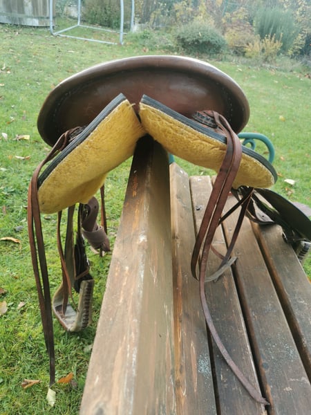 Westernsattel "Trail Rider" der Marke Deuber & Partner - Holzbaum in Standard Passform mit Fiberglas überzogen - Kammerweite: 03 FQH (20cm) - Sitzgröße: 16" - Leder: Havanna mit Bordertooling - 6x Lederconchos mit Latigostrings - Lederhorn und Rohhautsteigbügel - Skirtlänge: 62 cm - Skirttiefe: 31 cm - Gewicht: ca. 12 kg Kleinere oberflächliche Makel am Leder, aber ansonsten in gutem Zustand! Der String am Sattelgurt müsste ausgetauscht/ersetzt werden (siehe letztes Foto). Passt eher auf schmale Pferde. Selbstabholung in 2380.