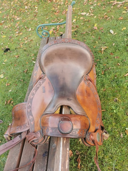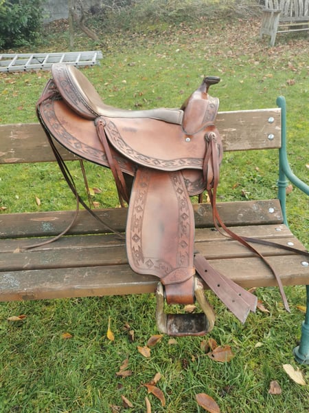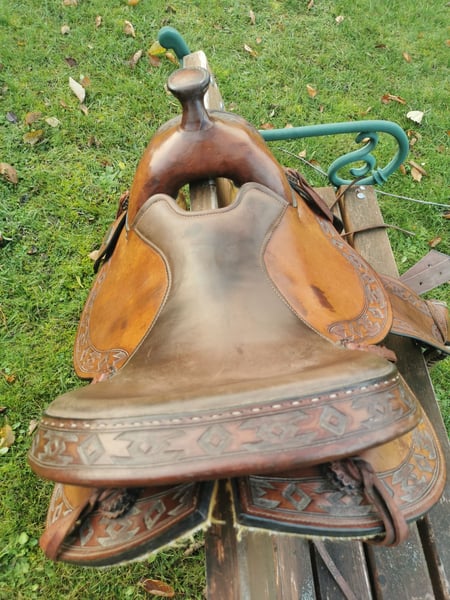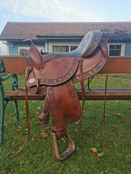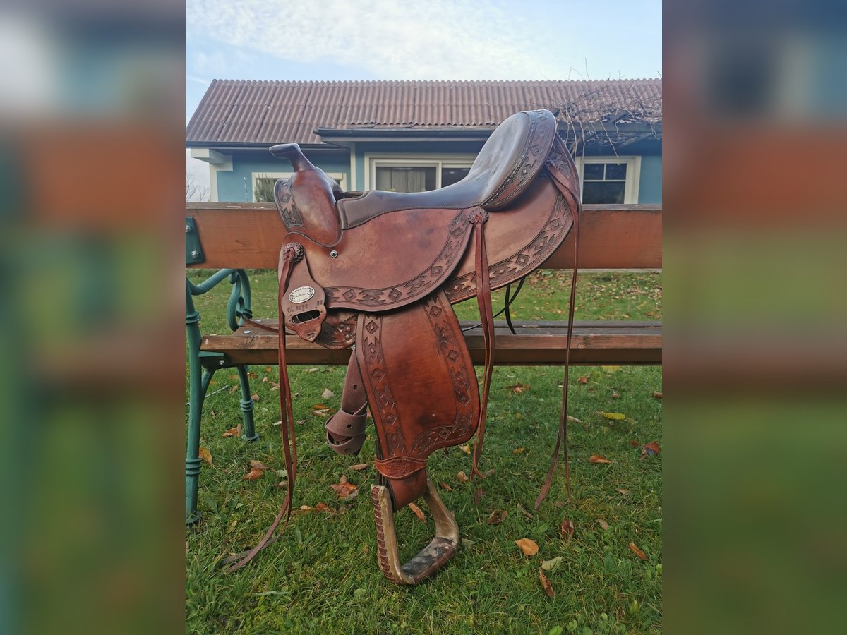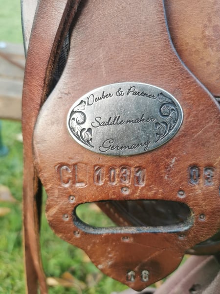 Westernsattel "Trail Rider" der Marke Deuber & Partner - Holzbaum in Standard Passform mit Fiberglas überzogen - Kammerweite: 03 FQH (20cm) - Sitzgröße: 16" - Leder: Havanna mit Bordertooling - 6x Lederconchos mit Latigostrings - Lederhorn und Rohhautsteigbügel - Skirtlänge: 62 cm - Skirttiefe: 31 cm - Gewicht: ca. 12 kg Kleinere oberflächliche Makel am Leder, aber ansonsten in gutem Zustand! Der String am Sattelgurt müsste ausgetauscht/ersetzt werden (siehe letztes Foto). Passt eher auf schmale Pferde. Selbstabholung in 2380.