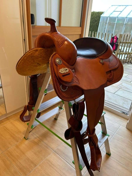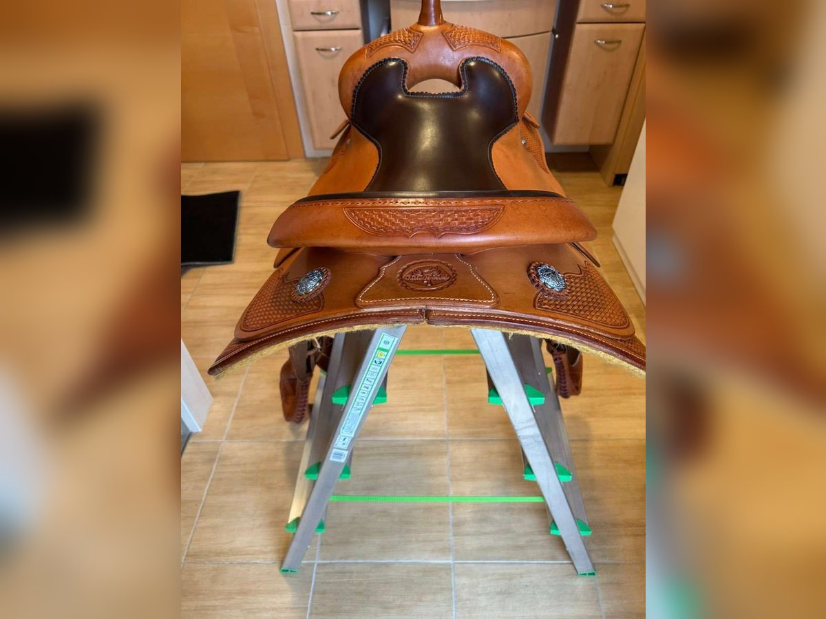 Ich verkaufe meinen hochwertigen Westernsattel der Platinum Series by Equine Designs – Made in the USA. Der Sattel ist nur ca. 1 Jahr alt und wurde maximal 10 Mal verwendet. Leider hat sich mein Pferd kurz nach dem Kauf schwer verletzt und musste anschließend eingeschläfert werden. Aus diesem Grund wird der Sattel nun schweren Herzens verkauft. Der Zustand ist nahezu neuwertig: • sehr hochwertiges, weiches Leder • saubere, aufwendige Punzierung • dekorative Silberbeschläge • sehr bequemer, tiefer Sitz Ideal für Freizeit-, Pleasure- und Horsemanship-Reiter. Kein Roping-Sattel. Details: • Marke: Equine Designs – Platinum Series • 6,25 Inch breit mittlerer Schwung mit Widerristfreiheit für WB • SQHB • Farbe: Natur / Hellbraun • Zustand: nahezu neuwertig, minimale Gebrauchsspuren • Standort: Lochen am See Besichtigung und Anprobe nach Absprache möglich. Preis: 3.700,00 € Privatverkauf – keine Garantie oder Rücknahme.
