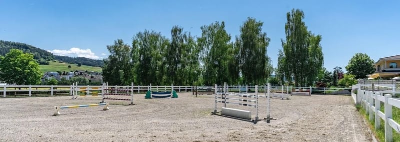 Exklusive Reitsportanlage mit mediterraner Villa und weitläufigem Land – Ostschweiz Diese aussergewöhnliche Reitsportanlage vereint höchste Funktionalität für den Pferdesport mit exklusivem Wohnen in mediterranem Ambiente. Auf einer Gesamtfläche von rund 32.000 m² bietet das Anwesen ideale Voraussetzungen für professionelle Pferdehaltung, Training sowie gehobenes Wohnen in absoluter Privatsphäre. Die Anlage umfasst eine moderne Reithalle, mehrere Stalltrakte, grosszügige Aussenflächen sowie eine hochwertige Villa mit separatem Grundstück. --- Reitsportanlage – Ausstattung & Highlights * Lichtdurchflutete Reithalle (25 x 50 m) mit hochwertigem Boden und Bewässerungssystem * 2 Stalltrakte mit insgesamt 19 Boxen (je ca. 3,5 x 4 m, mit Aussenfenstern) * Zusätzlicher Weidestall mit 4–6 Boxen * Überdachte Führanlage für 6 Pferde mit integriertem Longierkreis (Hippodrom) * Grosszügige Paddocks und Ausläufe mit befestigten Böden * Wetterfester Aussenreitplatz (30 x 60 m, erweiterbar auf 40 x 80 m) * Ca. 20.000 m² Weidefläche, teilweise mit Holzzäunen eingefasst * Reiterlounge mit direktem Blick in die Halle * Räume für Veranstaltungen (z. B. Turniersekretariat, Jury) * Separater Bereich für Tierarzt / Hufschmied * Grosses Ökonomiegebäude für Heu, Einstreu und Lagerung * Gesamte Anlage eingefriedet --- Villa – Wohnen auf höchstem Niveau Die freistehende Villa befindet sich auf einem separaten Grundstück (ca. 1.600 m²) und bietet rund 450 m² Wohnfläche. Highlights: * Mediterraner Baustil mit hochwertigem Innenausbau * 9,5 Zimmer, grosszügiges Raumkonzept * Lichtdurchflutete Räume mit hohen Decken * Edle Materialien, u. a. Marmor in Böden, Bädern und Cheminée * Moderne Küche mit Kochinsel * Mehrere Loggien sowie überdachte Sitzplätze * Ruhige, sonnige Südausrichtung * Absolute Privatsphäre durch separate Zufahrt (Birkenallee) --- Eckdaten Reitsportanlage: * Baujahr: 2014 * Grundstück: ca. 32.000 m² * Nutzung: Freizeit- und Landwirtschaftszone * Wärmeerzeugung: Wärmepumpe / Bodenheizung * Parkplätze: Grosszügig, auch für Pferdetransporter Villa: * Wohnfläche: ca. 450 m² * Zimmer: 9,5 * Badezimmer: 2 + Gäste-WC * Standard: Minergie * Parkplätze: 3 --- Lage Die Liegenschaft befindet sich in attraktiver Lage in der Ostschweiz und bietet eine ideale Kombination aus ruhiger, naturnaher Umgebung und gleichzeitig guter Erreichbarkeit. Perfekt für anspruchsvolle Pferdeliebhaber, Profis oder Investoren. --- Kaufpreis Auf Anfrage --- Sonstiges Die Verfügbarkeit erfolgt nach Vereinbarung. Weitere Informationen sowie eine Besichtigung erhalten Sie gerne auf Anfrage. Sonstiges Dieses Objekt bieten wir in Kooperation mit einem unserer Netzwerk-Makler an. Mit Ihrer Kontaktanfrage akzeptieren Sie, dass Sie sich für dieses Objekt interessieren und ein Expose von unserem Netzwerk-Makler anfragen. Ebenso bestätigen Sie die Provisionsvereinbarungen zwischen unserem Netzwerk-Makler und Ihnen, die im Falle eines notariell bestätigten Kaufvertrages rechtskräftig werden. Ebenso bestätigen Sie, dass wir berechtigt sind, Ihre Kontaktdaten an den Netzwerk-Makler weiterzuleiten.