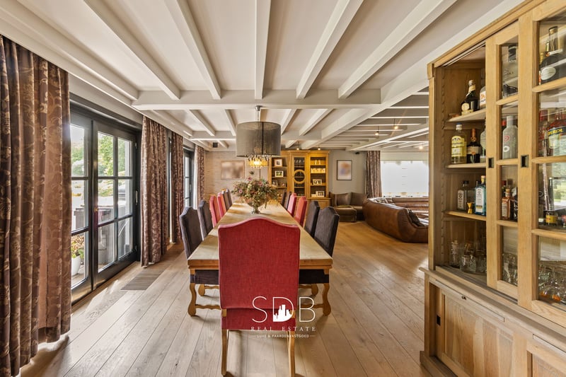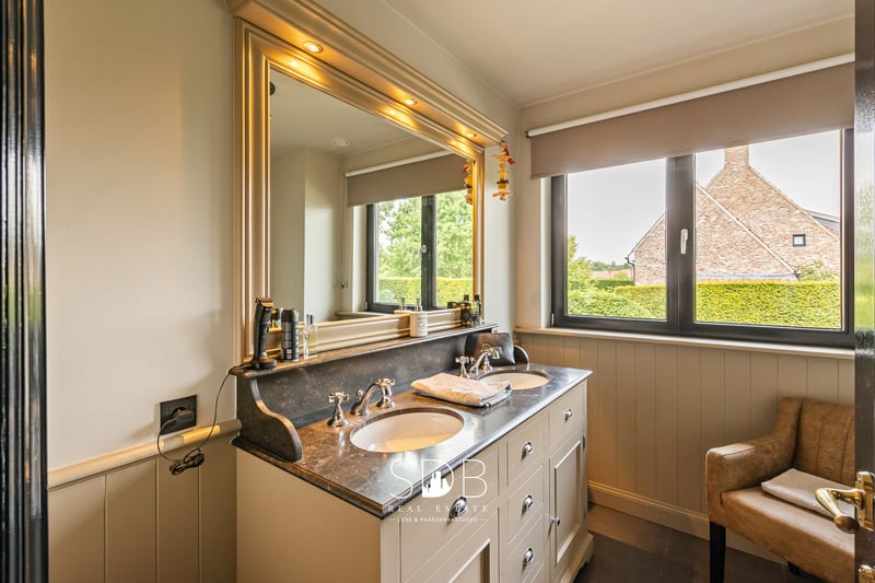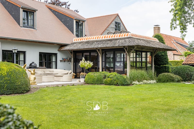 In Lochristi, a municipality in East Flanders, we find this beautiful rural villa with grasslands on 32.558 m². A quiet, green environment with good access to the city. Upon entering the house, we are immediately embraced by the charm of the villa. A spacious entrance hall guides us through the living areas. The beautiful country kitchen is fully equipped and features a stylish kitchen island with seating, perfect for cozy breakfasts or a glass of wine while cooking. Thanks to the use of sustainable materials, integrated appliances, and a harmonious layout, this space is not only very beautiful but also extremely practical. Adjacent to this is the spacious veranda in the same elegant style, which enjoys plenty of natural light thanks to the large windows, which can be fully opened. With an open view of the garden. The living room is divided into a cozy sitting area and a spacious dining area. Together, these form a cozy and inviting living space where atmosphere, comfort, and style blend seamlessly. The oak parquet flooring, built-in oak cupboards, wooden ceiling structures, and elegant fireplace provide timeless charm and a soothing atmosphere. A few steps higher, we find an office space. On the first floor, there are four full bedrooms. There are also two bathrooms, each in their characteristic rustic style. One bathroom is equipped with a double washbasin and a shower. The other bathroom is equipped with a double washbasin and a freestanding bathtub. Given the size of the house, the space between the floors offers additional living space. This living space includes a cozy sitting area and a dining area with an adjoining open country kitchen. From this living space, you have direct access to a spacious roof terrace with a beautiful view of the garden and the meadows behind. The house offers space for parking two cars. Adjacent to the garage is the spacious storage room, also known as the laundry room. Here you will find utilities for a washing machine and dryer. Adjacent to this is the basement, which can be used for storage and practical purposes. The landscaped garden, beautiful plants, sun terrace, and elegant pond are the ideal setting for relaxation and outdoor living in style! This property has parking spaces in front of the house but is also accessible via a side driveway that takes you to the rear. This driveway leads to the grasslands at the rear of the property. Various grasslands are divided into different plots, all enclosed by wooden fencing. Adjacent to an open stable building of no less than 173m². A footpath runs around the grasslands and the stable building, leading back to the villa in a loop. This beautiful villa exudes tranquility, refinement, and quality! Soft colors, rustic accents, and high-quality finishes.... With a unique view of the surrounding greenery and adjacent grasslands. An ideal domain for a horse lover or anyone looking for space for hobbies and outdoor living. Are you interested in this unique property? Please do not hesitate to contact us - www.sdb.realestate