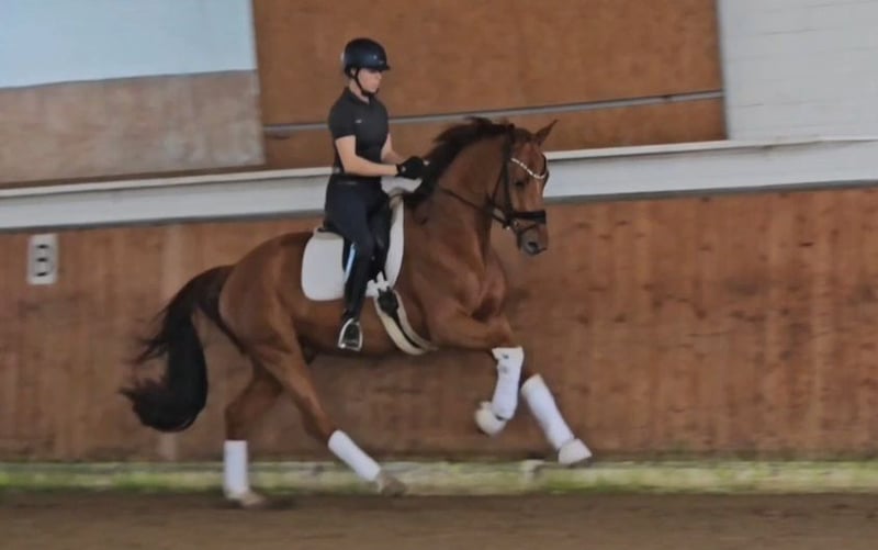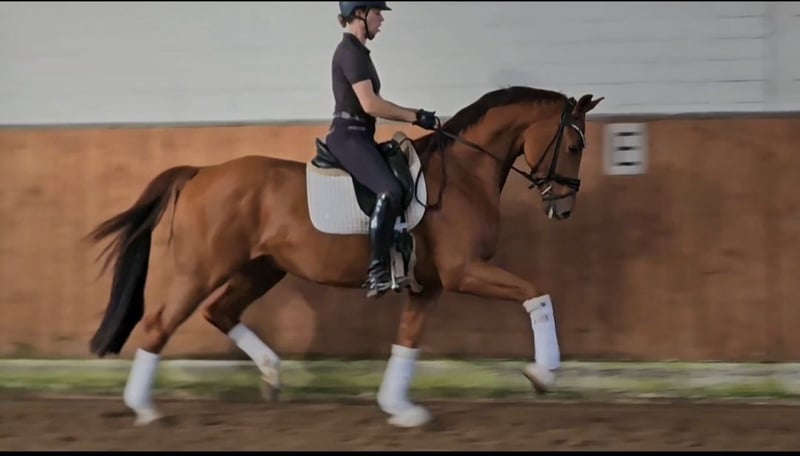 We charge a fee of €50 for the trial ride, which will of course be credited if the horse is purchased. For sale is a beautiful KWPN gelding, born in 2021. The elegant chestnut impresses with his friendly temperament and striking appearance. Standing at 16.1 hh, he offers the perfect size for ambitious riders looking to develop further in dressage. He has three very good basic gaits, with his uphill canter particularly noteworthy. His modern pedigree and versatile abilities in dressage training make him a promising partner for competitive riding at higher levels or for dedicated leisure riders. The gelding already shows a lot of talent and willingness to learn, is well-schooled at approximately level A to novice dressage, and is a pleasure to ride. A recent, good-quality X-ray examination is available. If interested, I am happy to provide further information exclusively at 01738219886.