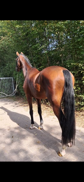 Here, a stunning large brown gelding is looking for his heart ❤️ person. Ricardo impresses not only with his appearance but also with his excellent basic gaits and wonderful character. A truly special horse is waiting here for his supporter. With an outstanding pedigree, character, and movements that leave nothing to be desired, he is a horse for the future, whether for a competition rider or an ambitious amateur. Of course, experience with young horses should be present to further support his training and unlock his potential. If you are interested in getting to know this dream horse, feel free to schedule an appointment for a trial ride. Trial ride €30. Phone 0178 6526058.