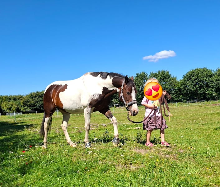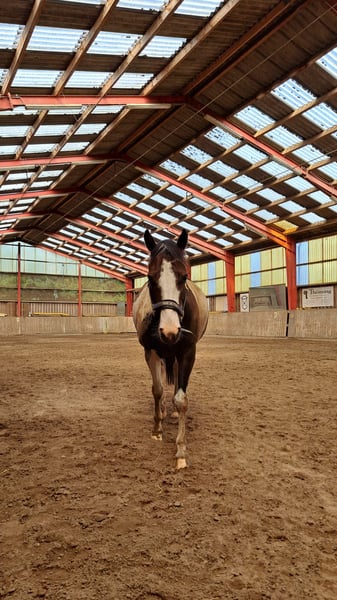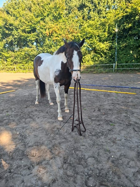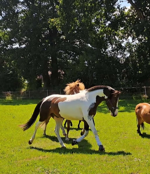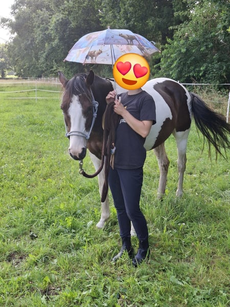 With a heavy heart, I am now looking for a new 5-star home for my pony due to family changes. Shadow is a versatile 7-year-old Lewitzer gelding with an approximate height of 14.5 hands. His build covers a lot of ground and makes him appear much larger. I am 5'4" myself. He is an absolute heartbreaker and seeks closeness and contact with people. Always friendly, curious, and affectionate. Although he can become a bit eager when it comes to his carrots 🥰. In the pasture, he greets you with a friendly nicker. He stands relaxed during grooming, tacking up, etc. If it were up to him, he would love to be groomed and pampered for hours. He is up for any fun and is familiar with scare training using tarps, flutter tapes, etc. The beach, cross-country, open fields, and showgrounds are all familiar environments for him. He is registered as a show pony. His training is varied, including riding in the arena/indoor, groundwork, trail riding, pole work, and also hacking out is part of his daily routine. He is also used to walking alongside a stroller. I mainly ride him for leisure in dressage, where he performs solidly at E/A level. He also jumps well and clearly enjoys it. He has previously competed in cross-country events with his former owner. He is more of a relaxed type rather than a speedster, but he is by no means sluggish. My 6-year-old daughter can ride all three gaits on him at the lunge line. He is kept with a large mixed herd of about 20 horses. In summer, he is turned out 24/7, and in winter, he stays in his box at night. His social behavior is friendly and affectionate, and he avoids stress. He has been regularly dewormed, and has been seen by the dentist, osteopath, and farrier, all of whom report him to be well-behaved and cooperative, giving all four hooves willingly. He has never been ill and has no pre-existing conditions. A veterinary health check can be arranged at the buyer’s expense. He possesses a passport and is 100% load-safe. What I wish for him is a home with loving people who understand horses, who will continue to support and develop him, as at 7 years old, he is far from finished with his training. Shadow will be sold with his tack and accessories. Videos can be sent upon serious interest.