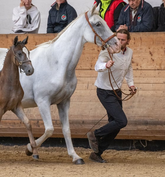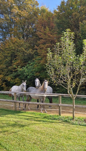 PLUTO FAMOSA 1 year old stallion will be gray Stallion height: dam 160/sire: 161cm Our youngest family member on our farm - our Plutolino. He was born in June 2024 and is still a real bundle of joy. Like his big full brother, he is more than down to earth. This is a horse that can't be ruffled and has been that way since birth. So if you are looking for an energetic Lipizzaner, Plutolino is the wrong horse for you. He will always be the calm and collected one. You don't have to draw attention to yourself with him. When he sees you, he comes backwards and sticks his butt out for a cuddle. He really is a very lovable and extremely friendly young lad. I can imagine Plutolino for someone who has high expectations but is looking for a very calm type. I can also imagine him as a therapy horse later on. Due to his gentleness and deep trust, there is a risk that a horse like Plutolino could be exploited. That's why I would only consider a person for him, where my gut feeling will tell me whether the person has enough heart and mind. His gait mechanics are already rhythmic and springy and radiate calmness. If this lad doesn't become soft to sit, then I've lost my eye for horses. Plutolino has lived in the mixed herd since birth, together with other youngsters, aunts and cousins, and is trained by all of them. The mixed herd offers so many advantages for growing up, as there is a fixed structure and the youngsters quickly have to subordinate themselves. They play and romp around with the other youngsters, but when the older mares say, "That's enough," the youngsters are immediately submissive and the ego can mature slowly and is not overtaxed. Such a closed herd gives the young horses security and I experience how a protected nest is good for personality development. That's why my young horses join the young horse group so late, or not at all. Pluto can move to his new home from January 2025, until then he will stay together in the herd with his mother and all his herd members. He knows the foal ABCs and is really easy to handle. He takes new things for granted and finds everything exciting. If you are interested and would like to meet Plutolino, you are welcome to visit us on our farm at any time. Our location: https://g.co/kgs/FbcJbm8 For further questions just write a Whatsapp under: 00386 68 129 392 - Angelika Greetings to all horse lovers Angelica PS: the last picture shows his sire PLUTO FAMOSA V www.hof-der-lipizzaner.com