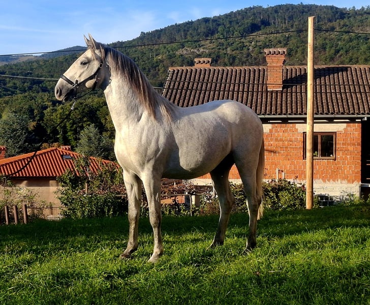 Young Lipizzaner Stallion - Born 2023 in Slovenia and sired by 388 Conversano Allegra XLVI (Lipica) Presenting 320 Conversano Thais VIII, an outstanding young stallion with a prestigious pedigree and a bright future. Born in 2023 in Slovenia, he gained attention at the 2024 LIF Championat in Lipica, where he achieved excellent results, showcasing his quality and potential as a top breeding stallion. Key attributes: ✶ Impeccable Lineage: Sired from elite bloodlines, his heritage reflects the best of the Lipizzaner breed. ✶ Proven Performance: Consistently praised for his conformation, movement, and temperament, he stood out at the LIF Championat, making him a high prospect for breeding and competitive pursuits. ✶ Excellent Temperament: Known for his calm and intelligent demeanor, he is a pleasure to work with and shows high trainability. If you want to add an exceptional young stallion to your breeding program or to develop a future star, 320 Conversano Thais VIII could be the perfect addition. Serious inquiries only. Location: Slovenia Contact: info@jjlipizzans.com, website: www.jjlipizzans.com