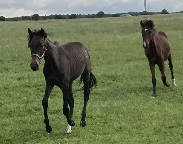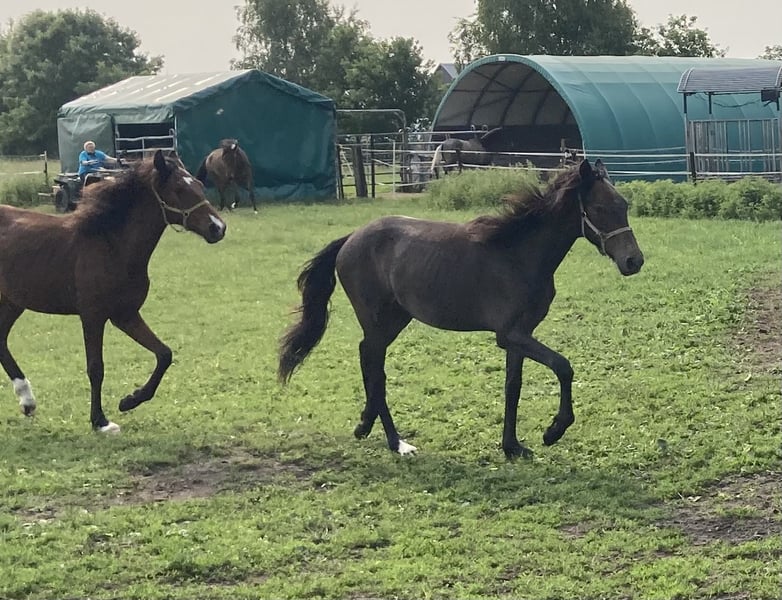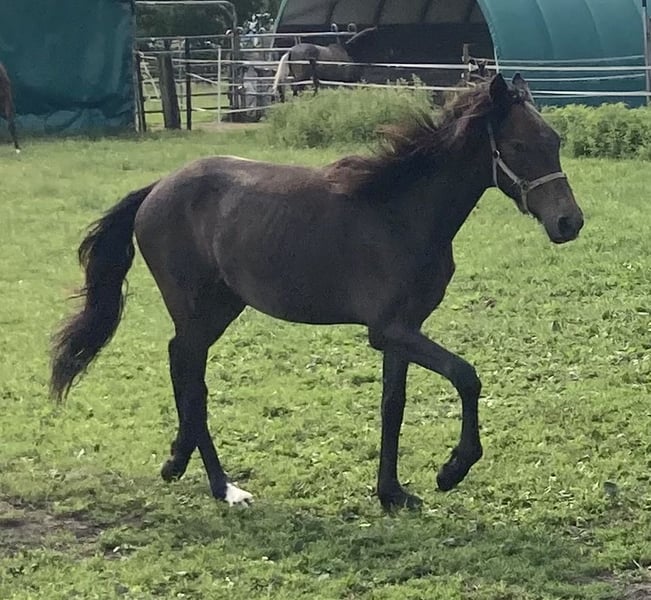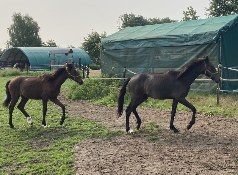 Extra vom Hartungshof, geb.am: 14.05.2024 ist bekam seinen Namen, weil er als neugeborenes Fohlen bereits extra chic, extra frech und extra eigenwillig war. Inzwischen als Wallach ist er immer an extra Streicheleinheiten interessiert und zeigt sich extra motiviert damit man Zeit mit ihm verbringt. Ausgestattet mit einer Gangveranlagung zu Marcha Batida und Marcha Picada und einem ansonsten auch extra gutem Gangwerk wird er einmal ein Freizeitpartner der Extraklasse werden, da bin ich mir sicher. Wenn er farbmäßig nach seiner Oma und seiner Mutter kommt, wird er in einigen Jahren nicht normal "ausgeschimmelt" sein sondern Fliegenschimmel. Und Extra wird für einen Mangalarga Marchador sehr groß werden (ausgehend von Vater, Mutter und Vollgeschwistern). Er hat wie alle unsere Fohlen das Fohlen ABC gelernt und ist ist gegen Tetanus, Influenza und Herpes schutzgeimpft. z.Zt. lebt er in einer etwas 20-köpfigen Pferdegruppe im Alter zwischen 6 Monaten und 29 Jahren mit Offenstall, Weidezelten, Paddock und großer Weide. Hier wird fleißig mit dem "jungen Gemüse" gespielt und die "Erwachsenen" achten darauf, dass man nicht zu übermütig wird. Auch von Extra gibt es nicht nur sehr wenige Fotos und kein Video, weil meine Gesundheit es sowohl in 2024 wie auch in 2025 schwierig gemacht hat zu fotografieren und z.zt. ist er auch dem Alter entsprechend "nicht Fisch, nicht Fleisch".