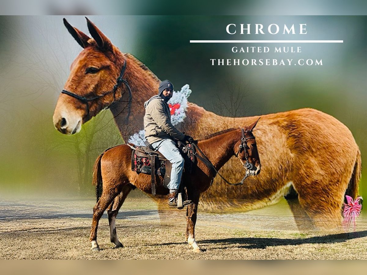 Chrome is a beautiful red sorrel gaited John mule with three white stockings—he’s got all the right color and eye appeal. At just 5 years old, standing at 14.2 he already shows an exceptional mind and temperament. He is calm, willing, laid-back, and slow-going, making him an ideal mule for the whole family. Chrome is sure-footed, quiet, and steady on the trail. He has been trail ridden extensively throughout Alabama, Mississippi, Kentucky, and Tennessee, and he’ll go anywhere you point him. He crosses creeks and logs with confidence and handles rough terrain like a seasoned mount. He has been ridden in traffic, gunfire from a .22 while coon and squirrel hunting, and has been packed off of. Chrome has also been around cattle and gets along well with other animals. If you’re looking for a trustworthy, gentle, and well-started young mule with plenty of experience and a great mind, Chrome is the kind you don’t find every day.