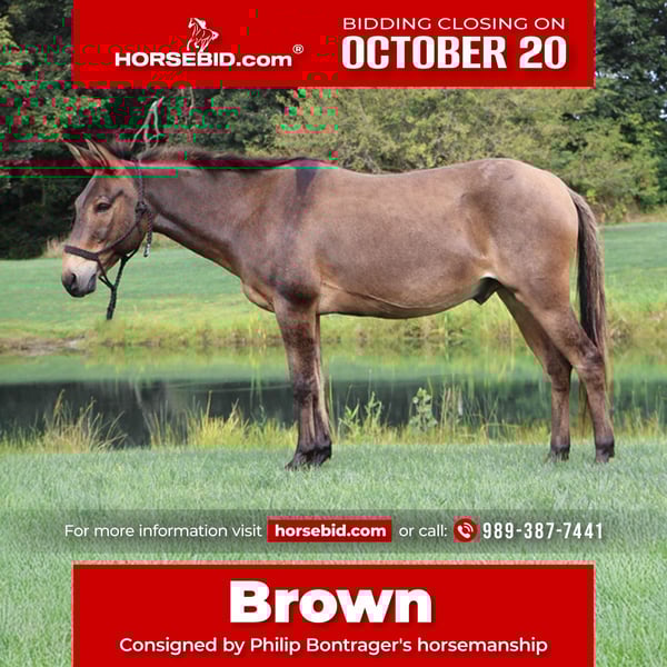 ♦️ 𝐭𝐡𝐞 𝐀𝐌𝐄𝐑𝐈𝐂𝐀𝐍 𝓕𝓪𝓵𝓵 𝓒𝓵𝓪𝓼𝓼𝓲𝓬 ♦️ Happening now thru MONDAY | OCTOBER 20th - Available EXCLUSIVELY on HorseBid's website! For more details and to register visit: www.Horsebid.com CONSIGNOR CONTACT: Philip Bontrager's Horsemanship 989-387-7441 LOCATION: Howell MI BREED: Mule REGISTERED: No COLOR: Bay HEIGHT: 13.3 AGE: 7 GENDER: John Mule I want to introduce you to a very unique mule, "Mr Brown". Brown as we call him is a 7-year-old bay John mule. He stands 13.3hh and weighs around 800 lbs. Brown rides english and western. He is a very good trail horse and is also very good with his arena work. He has a nice walk, trot, canter,and is very comfortable to ride. Brown lopes circles, takes both leads, and is soft in the bridle. Brown has been on many trail rides and on the road, he really enjoys it. He Loads, clips, and baths. I have done some roping with him, he is absolutely legit and fun to ride. Brown is a very beautiful mule and he is also very friendly. He is easy to catch and has good ground manners. Brown is 100% sound and he enjoys going on a trail ride. He is sensible and also has enough stamina to do a day's work. Brown is very sure-footed, he would make a good pack mule. He is very tough and he will trail ride all day, through brush, between trees,over logs, and through creeks. If you're looking for a good pack mule or an all around mule to ride then be sure to check out Mr. Brown. For more information or to schedule a visit with this unique mule, please call Phil @ 989-387-7441.