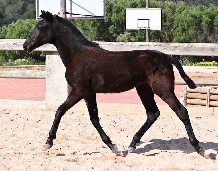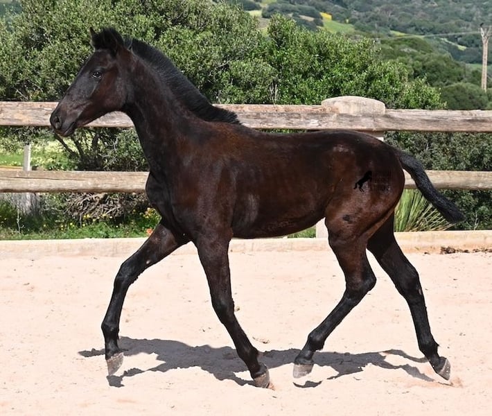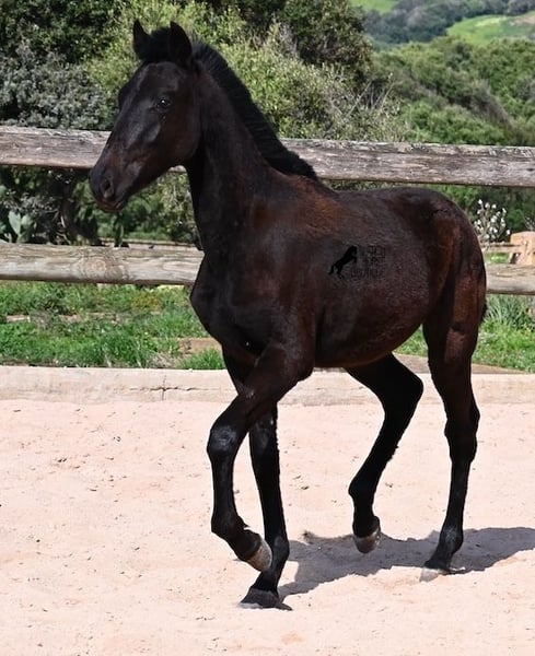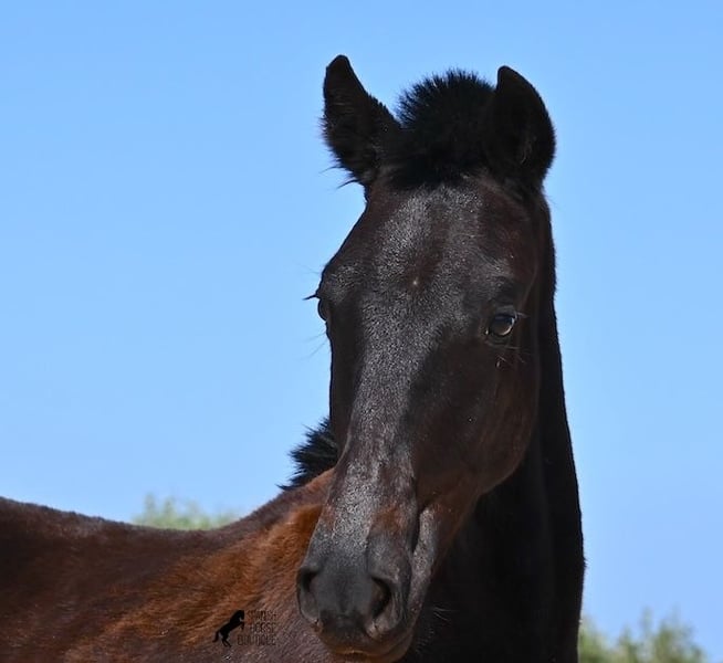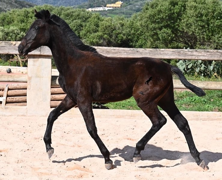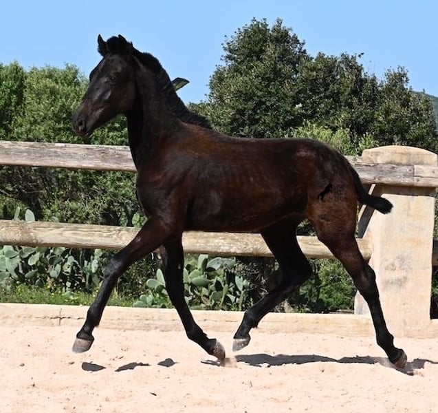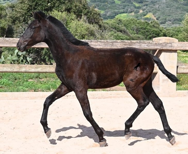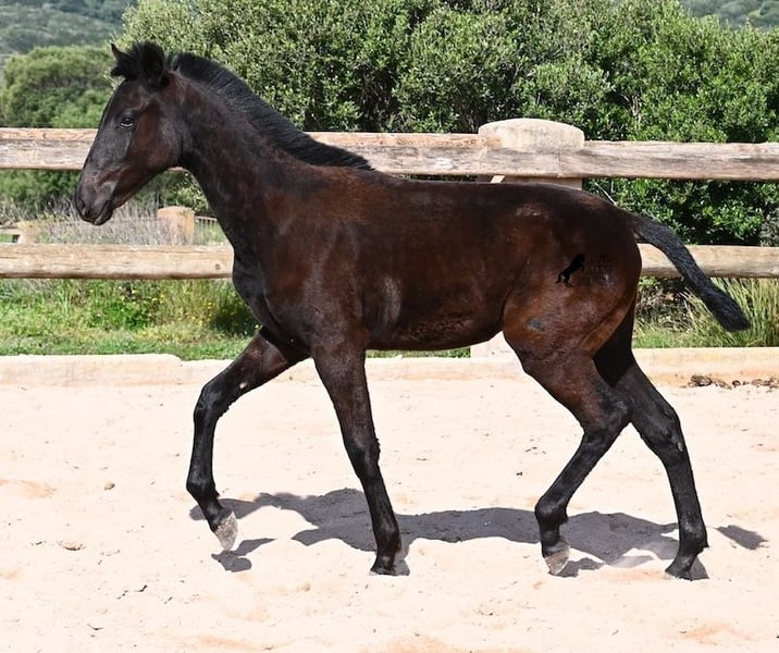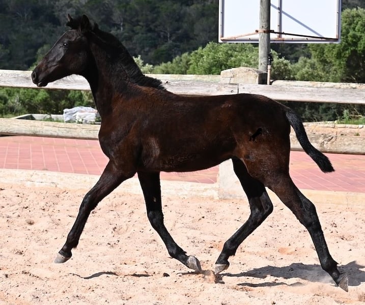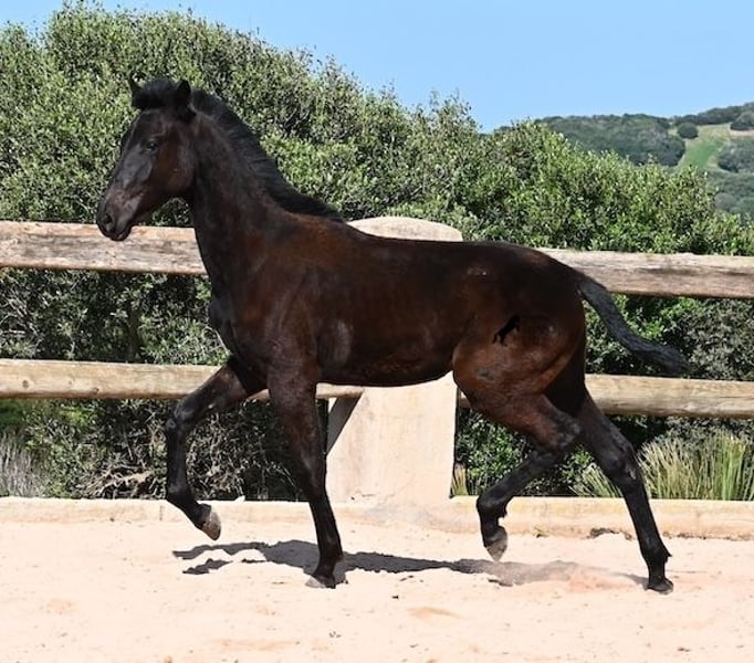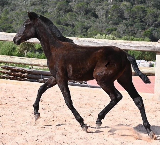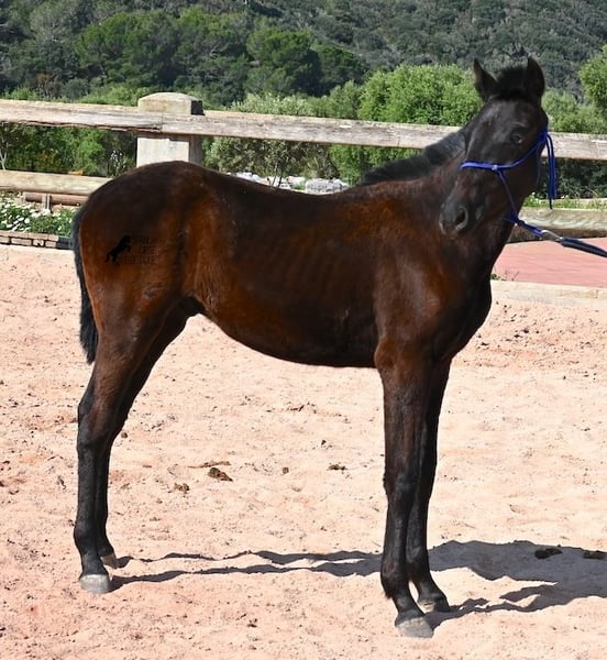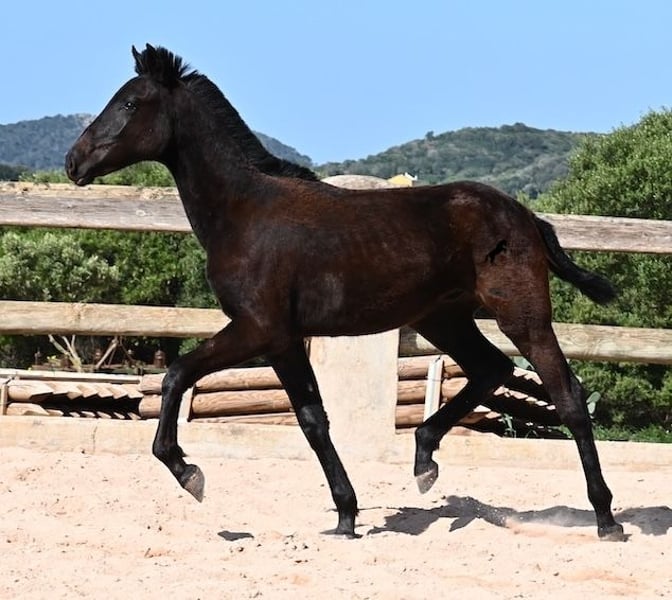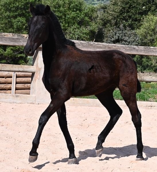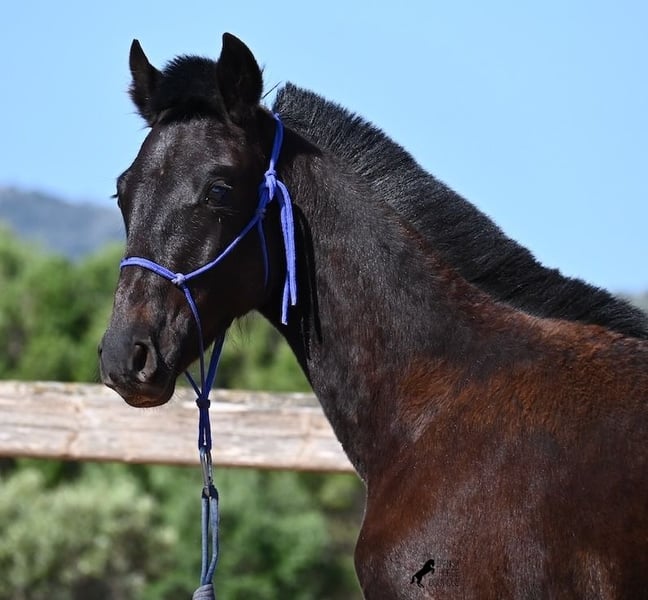 This purebred Menorquin stallion, born in 2024, is a truly adorable little guy. He dances elegantly across the arena, and even though he is currently incredibly sweet, he is sure to become an elegant representative of his breed! Thus, one can currently enjoy this cutie and at the same time look forward to what he will become. With his movement and very compact conformation, he will certainly be an ideal candidate for Working Equitation, Western riding, and of course as a leisure horse. He enjoys his foal life in the herd, is kept in a robust environment 24 hours a day on hard ground, and happily marches many kilometers with his buddies. As such, he is robust, has good hoof quality, and clear legs. In his veins flow old bloodlines of the Menorquin, which is reflected in his subtle knee movement, and he is likely not to be too tall—his expected final height is around 156 cm. He is halter-trained and ready to embark on the big journey—hopefully to you! He is currently located in Menorca! Videos and pedigree available upon request. I would be happy to organize an inspection, transport, or your journey should you wish to come see him in person. Details can be found on my page or in conversation. Greetings from Spain!