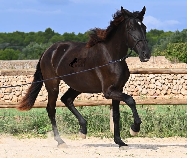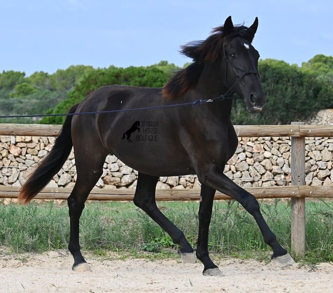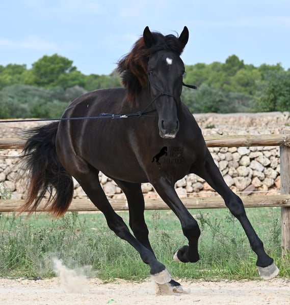 This purebred Menorquin mare, born in 2023, definitely aims high! Currently, she already measures 162 cm and will grow even more. She comes from very old lines of the Menorquin, although her father, at over 170 cm, belongs to the modern type. Her long legs know how to move, as she trots very balanced and has a good posture in the canter. Thus, she will later be interesting for many disciplines as a riding horse, especially for those who like larger horses. The star on her forehead makes her stand out from the crowd and shines as clearly as her eye. The young lady is very well-mannered and is already familiar with lunging in a halter, aside from daily handling; otherwise, she is naturally untrained due to her age. She lives in a herd and, thanks to the rough climate and rocky soils, has hard hooves and clear legs. She has "beautified" her muzzle with sand, but underneath, she is completely black. Her final height will definitely be over 165 cm. Videos and pedigree available upon request. Her location is Menorca. I would be happy to organize a foal vet check, transport, or her journey if you wish to come and see her in person. Details can be found on my page or in conversation. Greetings from Spain!