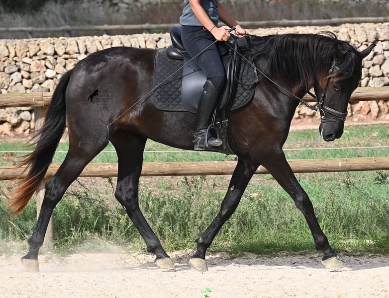 This 2022-born, purebred Menorquin mare has an invaluable character! She has been under saddle for a few months now and shines as a riding horse to such an extent that many fully trained horses can take her as an example. She doesn’t put a foot wrong, is incredibly attentive for a young horse, and remains so cool that nothing seems to faze her. She goes barefoot on trails, both alone and in a group, and even there she is absolutely well-behaved, which is not a given at her age. Her balance is truly remarkable for a young horse, and everything seems easy for her. Whether it’s maintaining contact or stretching nicely and marching along on a long rein, she handles it all with ease. Dogs of all sizes and the hustle and bustle of the farm with tractors and the like are part of her daily life, and she remains completely calm in those situations as well. Her pedigree combines a breed champion on her sire's side and very old lines of Menorquin on her dam's side, making her a versatile all-rounder! Her baroque and compact conformation also makes her interesting for Working Equitation. With her character, she is also a truly good family horse, as she is incredibly sweet to handle and ideal under saddle for learning together or going on leisurely rides. She lives in a herd environment, and thanks to the rough climate and rocky terrain, she has tough hooves and sound legs. She is also familiar with stalls and is always ready to travel to her new home :) The "sand lipstick" is, by the way, not permanent; she just decorated her muzzle individually for the photos ;) Currently, she measures around 161 cm, and her final height will be a few centimeters above that. The "sand lipstick" is, by the way, not permanent; she just decorated her muzzle individually for the photos ;) Videos and pedigree available upon request. Her location is Menorca. I am happy to organize a vet check for the foal on-site, transport, or her journey should you wish to come see her in person. Details can be found on my page or in conversation. Greetings from Spain!