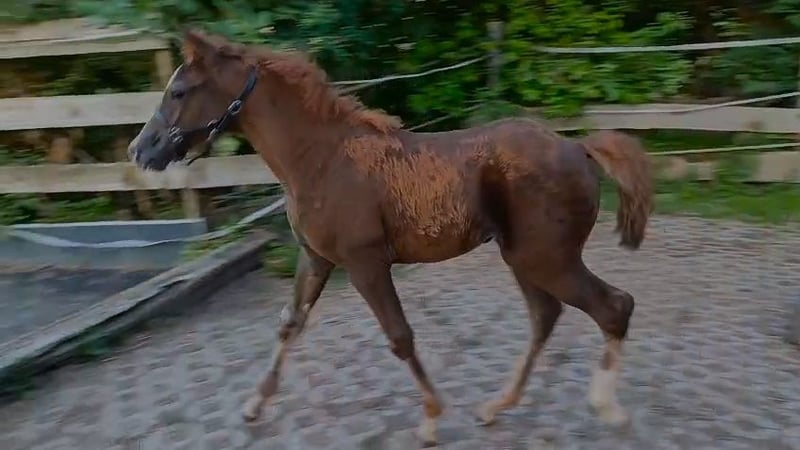 Diese menschenbezogene nervenstarke muskulöse kräftig kompakt gebaute Stute mit starken Sprunggelenken scheint in die Fußstapfen ihrer Eltern und Großeltern zu treten. Video 2 zeigt ihre kräftige Mutter im Alter von 2 1/2 Jahren. Völlig untrainiert zeigt die Mutter einen Qualitätsnaturfoxtrott. Video 3 zeigt ihre Großmutter während der Weltmeisterschaften in den USA. Ihr Großvater ist Gunslingers Velvet Vegas, der bestbewertete und meistgenutzte Zuchthengst in Europa. Ihr Vater hat schon einige Qualitätsfohlen gezeugt und wird bald gekört. In ihrer Spezialgangart Flat Foot Walk schwingt Jolly ihre Energie locker federnd durch ihren gesamten Körper, was einen angenehmen Reitkomfort erwarten lässt (sehr viel natürlichr Rhythmus und Raumgriff). Dabei ist sie sehr raumgreifend und fleißig (ground eating horse). Sie ist ein vielversprechendes Showpferd. Gute Showpferde sind auch im Gelände mit hohem Reitkomfort unterwegs. Video 4 zeigt sehr deutlich die Verzögerung in der Hinterhand (Sprunggelenk) im Flat Foot Walk als Voraussetzung für einen hochqualitativen rassespezifischen Foxtrott. Sie kann im Herbst mit amerikanischer Registrierung und einem lila europäischen Zuchtequidenpass des Spezialzuchtverbandes für Missouri Foxtrotter abgegeben werden. Die Tierärztin hat sie als Kohlfuchs identifiziert. s. auch meine Homepage http://www.taunus-foxtrotter-ranch.net