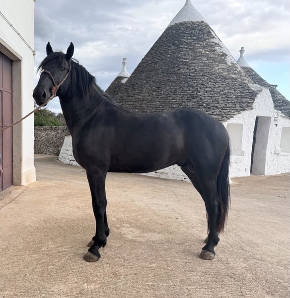 Toto embodies the original lineage of this impressive breed and possesses everything one would expect from a true baroque horse: a strong build, elegant appearance, and an honest, clear gaze. We estimate his final height to be over 165 cm – making him ideal for riders who appreciate size and presence. Toto grew up in a herd environment, knows the basics of being a foal, and always presents himself as friendly, attentive, and people-oriented. Castration on request can be arranged on-site. X-rays are available and can be viewed upon serious interest. We also plan everything else for you – clinical purchase examination, handling of the purchase contract, transport to your home stable, etc. Cavallo Murgese.de – on behalf of and in collaboration with the Italian Murgese Association A.N.A.M.F.