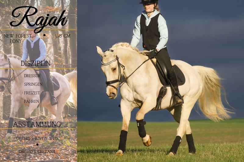 Rajah ist eine New Forest Stute ca. 158 cm geb. 2009 v. Orchid´s Justin wed., Kwaliteit,Ismar x Orchid´s Cestanii, Kantje´s Ronaldo *Rajah*ist eine wunderschöne und super liebe Stute mit schönen Bewegungen. Sie ist schön zu reiten in der Bahn und geht super alleine wie auch in der Gruppe ins Gelände. Rajah ist zudem gefahren. Sie ist super cool und unerschrocken auch fremde Umgebungen sind kein Problem für sie. Auf und mit ihr fühlt man sich sicher und wohl. Sie möchte immer gefallen, ist überhaupt nicht stutig, einfach eine traumhafte Maus. !!! SCHAUEN SIE SICH UNBEDINGT IHR VIDEO AN !!! Im Umgang auch super brav und gut erzogen. Eine Schönheit von innen und außen zum verlieben Pferdehandlung Dederichs – Ihr Partner für den Pferdekauf Kontakt & Erreichbarkeit: Anfragen bitte ausschließlich telefonisch unter 0173/9792139 Montag – Freitag: 09:00 – 18:00 Uhr Samstag: 09:00 – 15:00 Uhr Sonntag: Ruhetag Folgen Sie uns auf Social Media! Erleben Sie unseren Alltag mit den Verkaufspferden auf Instagram, TikTok & Facebook unter Pferdehandlung Dederichs Rabatt: Bei sofortiger Mitnahme Ihres neuen Traumpferdes erhalten Sie zwischen 5 %– 10 % Rabatt Probereiten & Vorführen: • Probereiten: 30 € pro Pferd (max. 2 Reiter), Betrag wird beim Kauf angerechnet • Feiertage: Proberitt 50 € • Vorführung durch unsere Bereiter: 25 € pro Pferd (Vorreiten, Bodenarbeit etc.) Ankaufsuntersuchung & Transport: • Viele unserer Pferde besitzen bereits eine AKU • Sie können selbstverständlich Ihren eigenen Tierarzt mitbringen • Gerne organisieren wir eine Untersuchung • Wir unterstützen Sie auch gerne beim Transport ins neue Zuhause Weitere Verkaufspferde: In unserem Stall stehen weitere Verkaufspferde, die noch nicht online sind. Falls Ihr Traumpferd noch nicht dabei ist, zögern Sie nicht, uns zu kontaktieren. Wichtige Hinweise: • Stockmaß-Angaben sind geschätzt und nicht exakt nachgemessen • Alle Beschreibungen sind subjektive Einschätzungen des Verkäufers und keine zugesicherten Eigenschaften