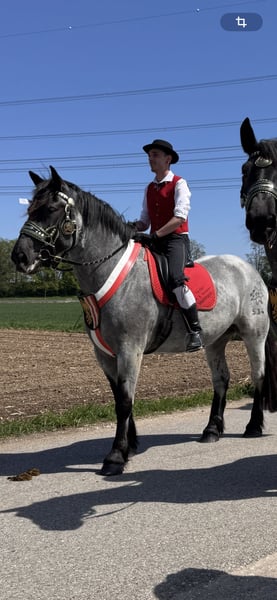 For sale is a 6.5-year-old Noriker mare. "Romina" is backed and well-ridden in walk and trot, with potential for improvement in canter. She is familiar with pole work on the lunge or under saddle. She can also go out on trail rides alone or in a group, and she is safe in traffic (road traffic, etc.).
