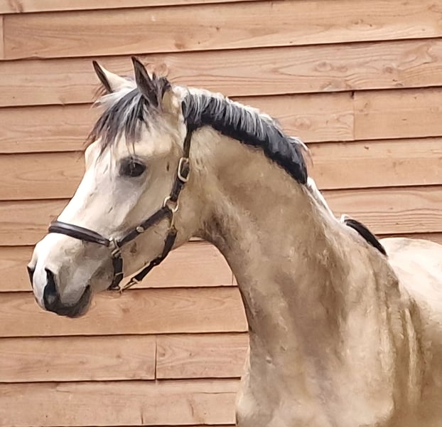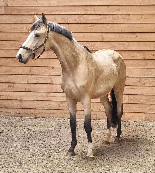 Spectaculaire 3 jarige valkhengst! Krem x Vivaldi x Temptation Hij beweegt met veel takt en souplesse! Hij heeft momenteel een stokmaat van circa 1.64m. Zal nog een spurtje gaan maken. Hij is rontgen gekeurd incl. Hals en rug. Nu nog onbeleerd. Hij heeft een aanhankelijk karakter en geniet van aandacht, komt graag ff bij je staan. Voor meer info en/of filmpje graag ff bellen of appen, 0613704472 #valk #buckskin #dressagehorsesofinstagram #forsale #buckskinsofinstagram